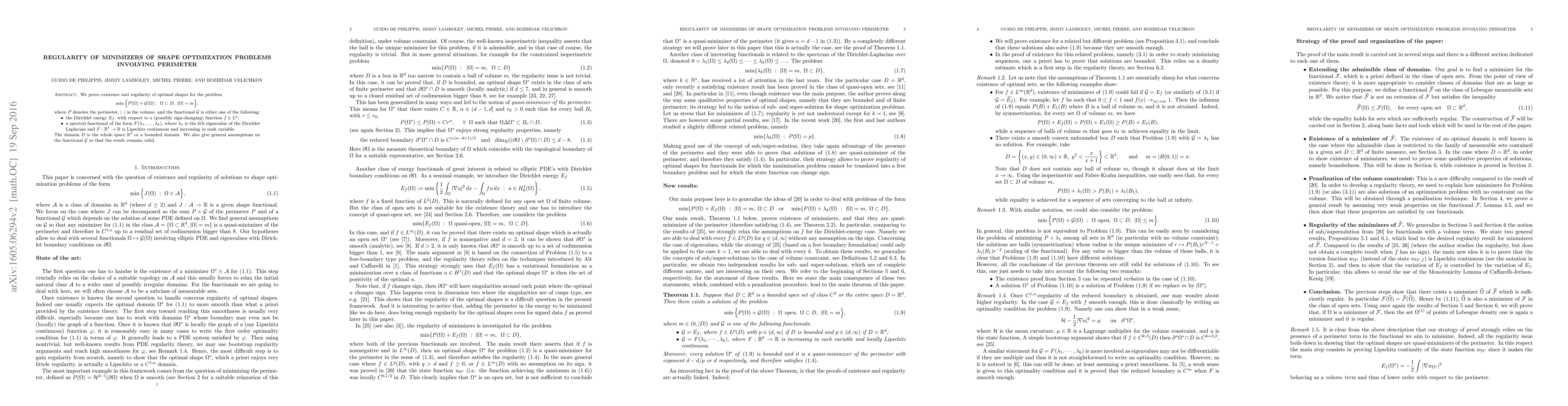 This research proves the existence and regularity of optimal shapes for shape optimization problems involving perimeter and various functionals, including Dirichlet energy and spectral functionals.