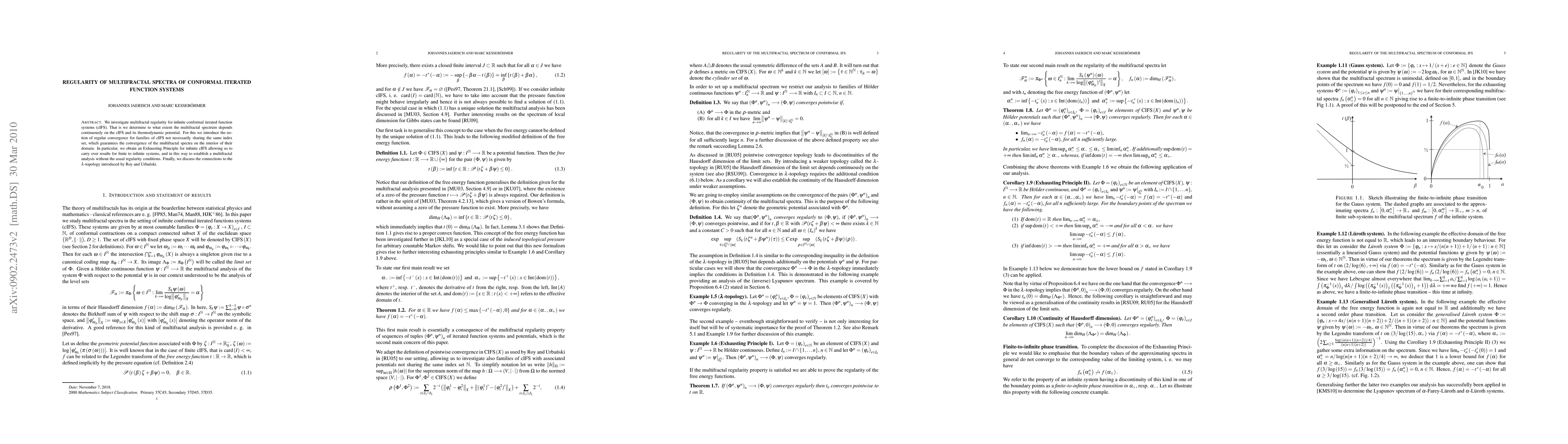 We investigate multifractal regularity for infinite conformal iterated function systems (cIFS). That is we determine to what extent the multifractal spectrum depends continuously on the cIFS and its thermodynamic potential. For this we introduce the notion of regular convergence for families of cIFS not necessarily sharing the same index set, which guarantees the convergence of the multifractal spectra on the interior of their domain. In particular, we obtain an Exhausting Principle for infinite cIFS allowing us to carry over results for finite to infinite systems, and in this way to establish a multifractal analysis without the usual regularity conditions. Finally, we discuss the connections to the $\lambda$-topology introduced by Roy and Urbas{\'n}ki.