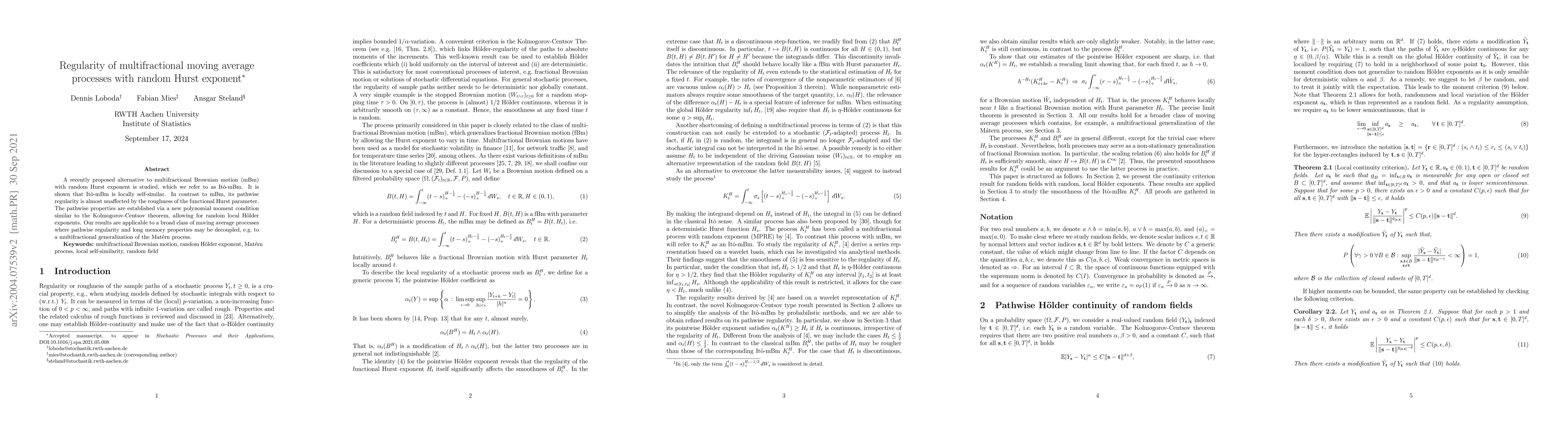 A recently proposed alternative to multifractional Brownian motion (mBm) with random Hurst exponent is studied, which we refer to as It\^o-mBm. It is shown that It\^o-mBm is locally self-similar. In contrast to mBm, its pathwise regularity is almost unaffected by the roughness of the functional Hurst parameter. The pathwise properties are established via a new polynomial moment condition similar to the Kolmogorov-Chentsov theorem, allowing for random local H\"older exponents. Our results are applicable to a broad class of moving average processes where pathwise regularity and long memory properties may be decoupled, e.g. to a multifractional generalization of the Mat\'ern process.