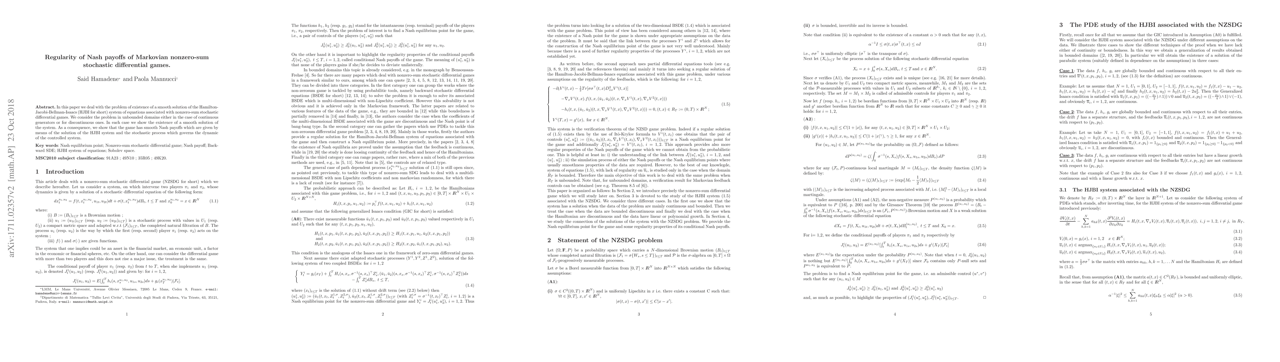 In this paper we deal with the problem of existence of a smooth solution of the Hamilton-Jacobi-Bellman-Isaacs (HJBI for short) system of equations associated with nonzero-sum stochastic differential games. We consider the problem in unbounded domains either in the case of continuous generators or for discontinuous ones. In each case we show the existence of a smooth solution of the system. As a consequence, we show that the game has smooth Nash payoffs which are given by means of the solution of the HJBI system and the stochastic process which governs the dynamic of the controlled system.