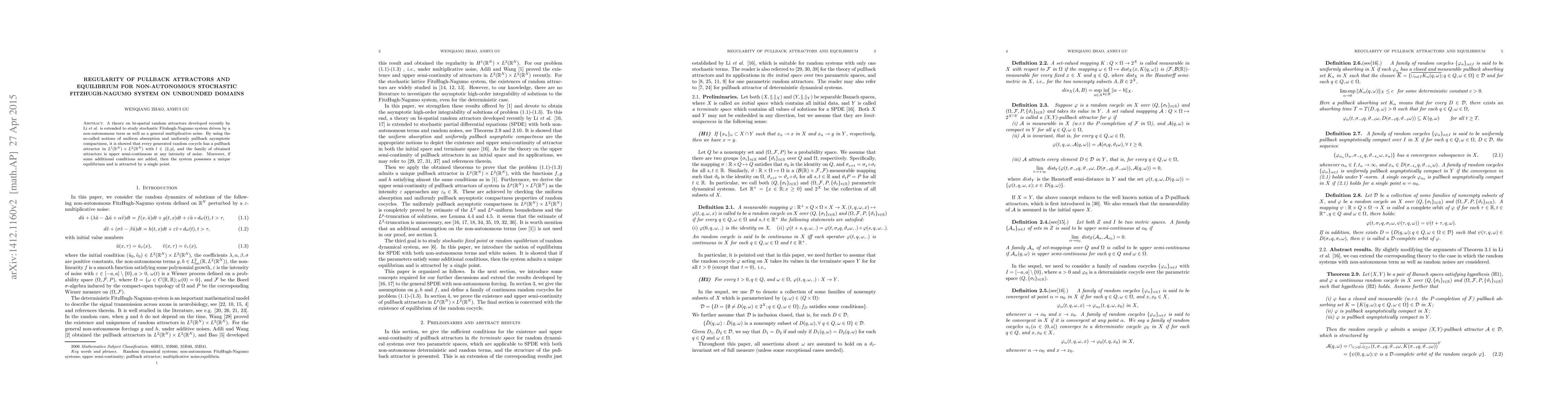 Summary: The paper extends a theory on bi-spatial random attractors to study the stochastic FitzHugh-Nagumo system with non-autonomous terms and multiplicative noise, proving the existence and upper semi-continuity of pullback attractors. Additionally, under supplementary conditions, the system achieves a unique equilibrium state.