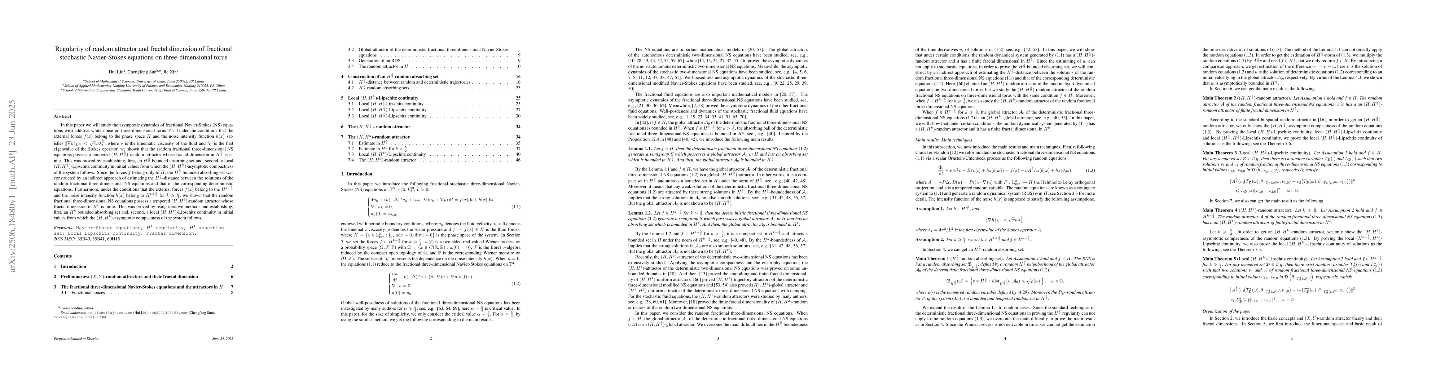 In this paper we will study the asymptotic dynamics of fractional Navier-Stokes (NS) equations with additive white noise on three-dimensional torus $\mathbb T^3$. Under the conditions that the external forces $f(x)$ belong to the phase space $ H$ and the noise intensity function $h(x)$ satisfies $\|\nabla h\|_{L^\infty} < \sqrt \pi \nu \lambda_1^\frac{5}{4}$, where $ \nu $ is the kinematic viscosity of the fluid and $\lambda_1$ is the first eigenvalue of the Stokes operator, we shown that the random fractional three-dimensional NS equations possess a tempered $(H,H^\frac{5}{2})$-random attractor whose fractal dimension in $H^\frac{5}{2}$ is finite. This was proved by establishing, first, an $H^\frac{5}{2}$ bounded absorbing set and, second, a local $(H,H^\frac{5}{2})$-Lipschitz continuity in initial values from which the $(H,H^\frac{5}{2})$-asymptotic compactness of the system follows. Since the forces $f$ belong only to $H$, the $H^\frac{5}{2}$ bounded absorbing set was constructed by an indirect approach of estimating the $H^\frac{5}{2}$-distance between the solutions of the random fractional three-dimensional NS equations and that of the corresponding deterministic equations. Furthermore, under the conditions that the external forces $f(x)$ belong to the $ H^{k-\frac{5}{4}}$ and the noise intensity function $h(x)$ belong to $H^{k+\frac{5}{4}}$ for $k\geq\frac{5}{2}$, we shown that the random fractional three-dimensional NS equations possess a tempered $(H,H^k)$-random attractor whose fractal dimension in $H^k$ is finite. This was proved by using iterative methods and establishing, first, an $H^k$ bounded absorbing set and, second, a local $(H,H^k)$-Lipschitz continuity in initial values from which the $(H,H^k)$-asymptotic compactness of the system follows.