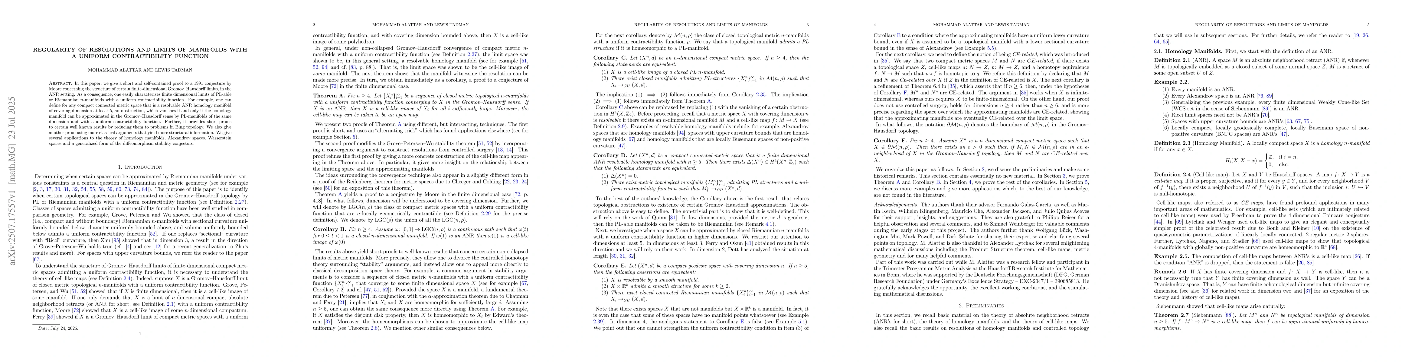 In this paper, we give a short and self-contained proof to a 1991 conjecture by Moore concerning the structure of certain finite-dimensional Gromov--Hausdorff limits, in the ANR setting. As a consequence, one easily characterizes finite dimensional limits of PL-able or Riemannian $n$-manifolds with a uniform contractibility function. For example, one can define for any compact connected metric space that is a resolvable ANR homology manifold of covering dimension at least 5, an obstruction, which vanishes if and only if the homology manifold can be approximated in the Gromov--Hausdorff sense by PL-manifolds of the same dimension and with a uniform contractibility function. Further, it provides short proofs to certain well known results by reducing them to problems in Bing topology. We also give another proof using more classical arguments that yield more structural information. We give several applications to the theory of homology manifolds, Alexandrov spaces, Wasserstein spaces and a generalized form of the diffeomorphism stability conjecture.