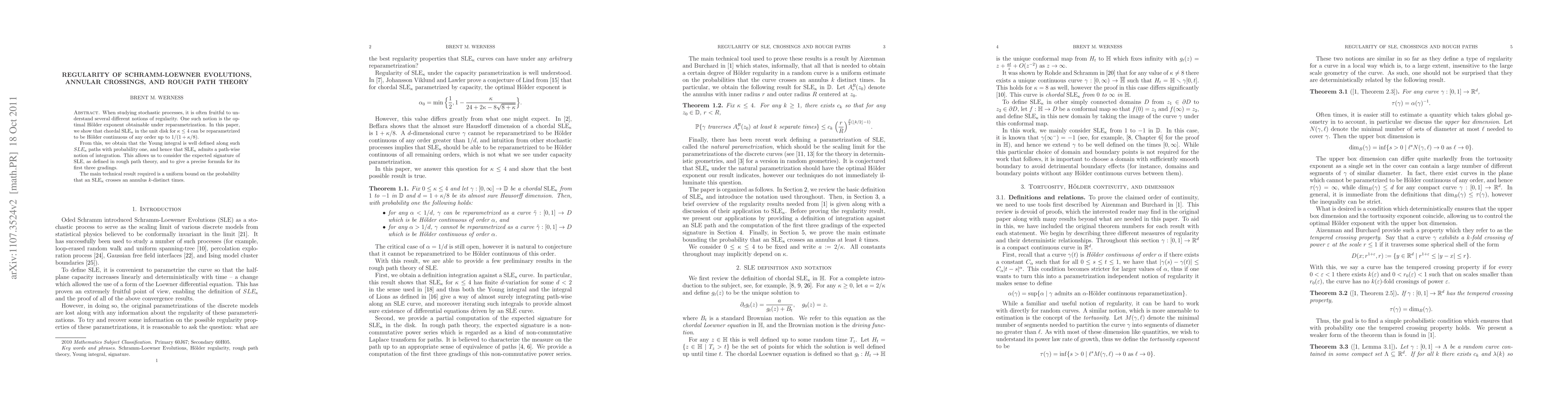 When studying stochastic processes, it is often fruitful to have an understanding of several different notions of regularity. One such notion is the optimal H\"older exponent obtainable under reparametrization. In this paper, we show that the chordal SLE_kappa path in the unit disk for kappa less than or equal to 4 can be reparametrized to be H\"older continuous of any order up to 1/(1+kappa/8). From this result, we obtain that the Young integral is well defined along such SLE paths with probability one, and hence that SLE admits a path-wise notion of integration. This allows for us to consider the expected signature of SLE, as defined in rough path theory, and to give a precise formula for its first three gradings. The main technical result required is a uniform bound on the probability that a SLE crosses an annulus k-distinct times.