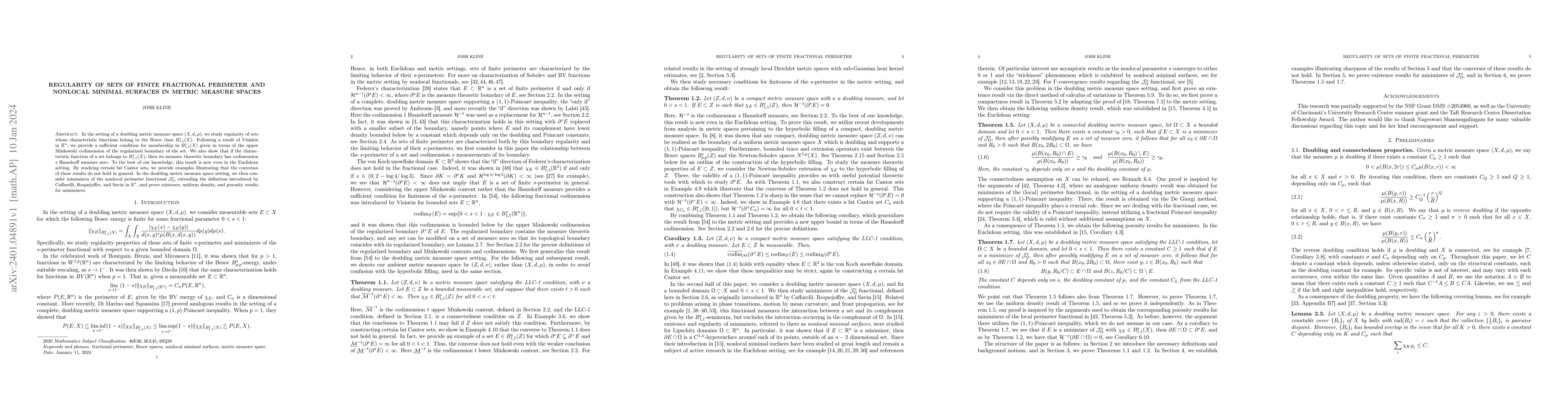 This paper explores the regularity of sets with finite fractional perimeter in doubling metric measure spaces, providing conditions for sets whose characteristic functions belong to the Besov class $B^s_{1,1}(X)$. It establishes that such sets have Hausdorff measure codimension $s$ and discusses nonlocal minimal surfaces, proving existence and properties of minimizers for the nonlocal perimeter functional.