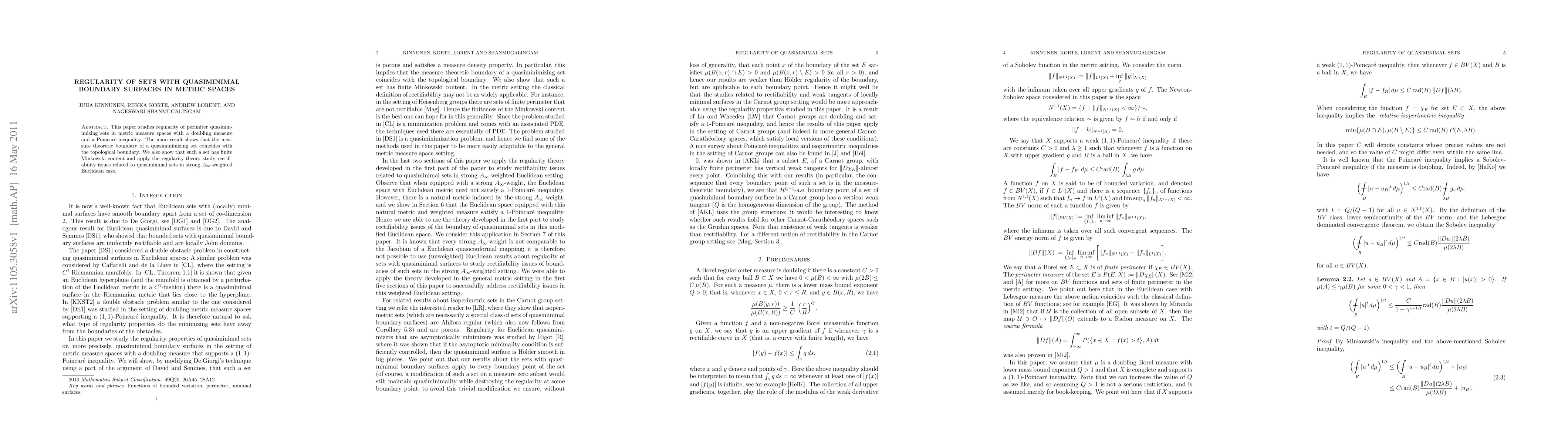 This paper studies regularity of perimiter quasiminimizing sets in metric measure spaces with a doubling measure and a Poincare inequality. The main result shows that the measure theoretic boundary of a quasiminimizing set coincides with the topological boundary. We also show that such a set has finite Minkowski content and apply the regularity theory to study rectifiability issues related to quasiminimal sets in strong A_{\infty}-weighted Euclidean case.