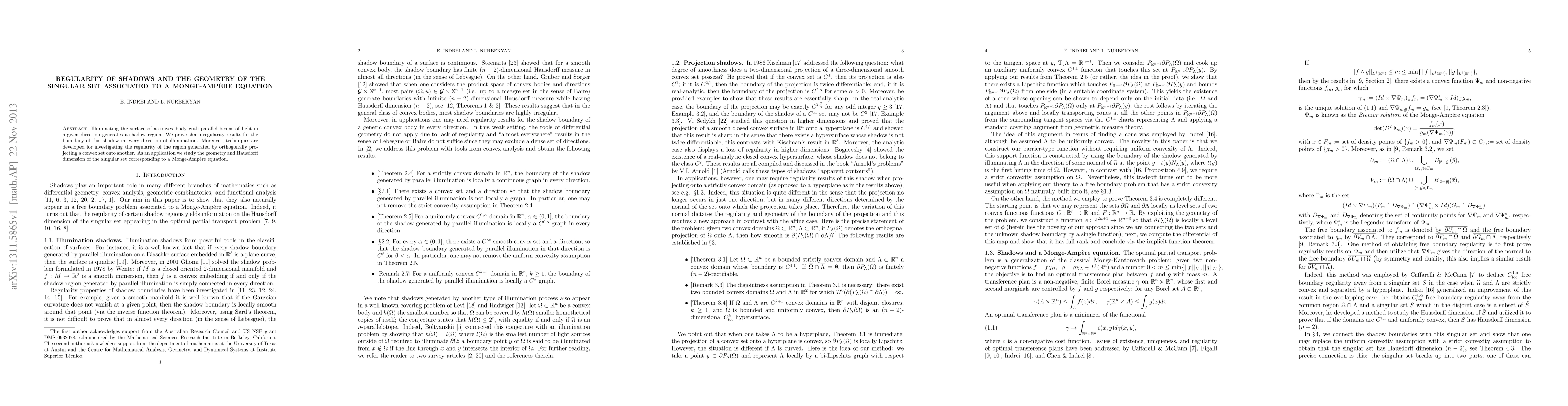 This paper proves sharp regularity results for the boundary of shadows cast by convex bodies under parallel illumination, and develops techniques to study orthogonal projections of convex sets. It applies these methods to investigate the geometry and Hausdorff dimension of the singular set associated with a Monge-Ampere equation.