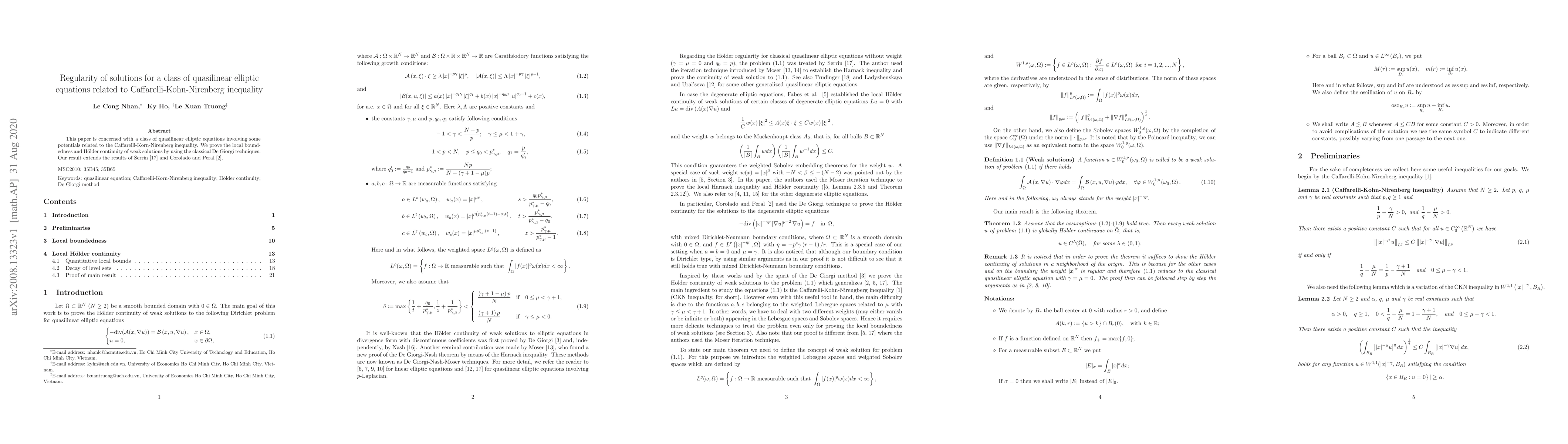 This paper investigates quasilinear elliptic equations tied to the Caffarelli-Kohn-Nirenberg inequality, proving local boundedness and Hölder continuity of weak solutions using De Giorgi methods. The findings extend prior results by Serrin and by Colorado and Peral.