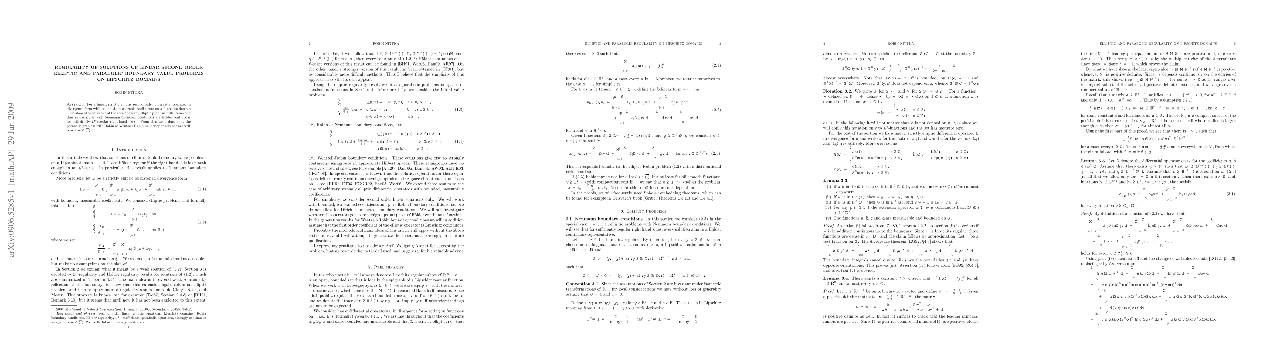 For a linear, strictly elliptic second order differential operator in divergence form with bounded, measurable coefficients on a Lipschitz domain $\Omega$ we show that solutions of the corresponding elliptic problem with Robin and thus in particular with Neumann boundary conditions are Hoelder continuous for sufficiently $L^p$-regular right-hand sides. From this we deduce that the parabolic problem with Robin or Wentzell-Robin boundary conditions are well-posed on $\mathrm{C}(\bar{\Omega})$.