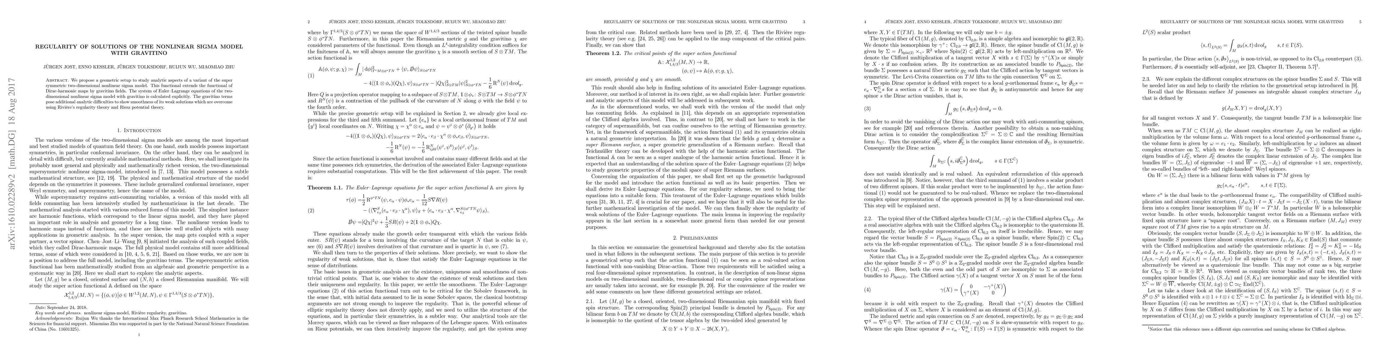 We propose a geometric setup to study analytic aspects of a variant of the super symmetric two-dimensional nonlinear sigma model. This functional extends the functional of Dirac-harmonic maps by gravitino fields. The system of Euler--Lagrange equations of the two-dimensional nonlinear sigma model with gravitino is calculated explicitly. The gravitino terms pose additional analytic difficulties to show smoothness of its weak solutions which are overcome using Rivi\`ere's regularity theory and Riesz potential theory.