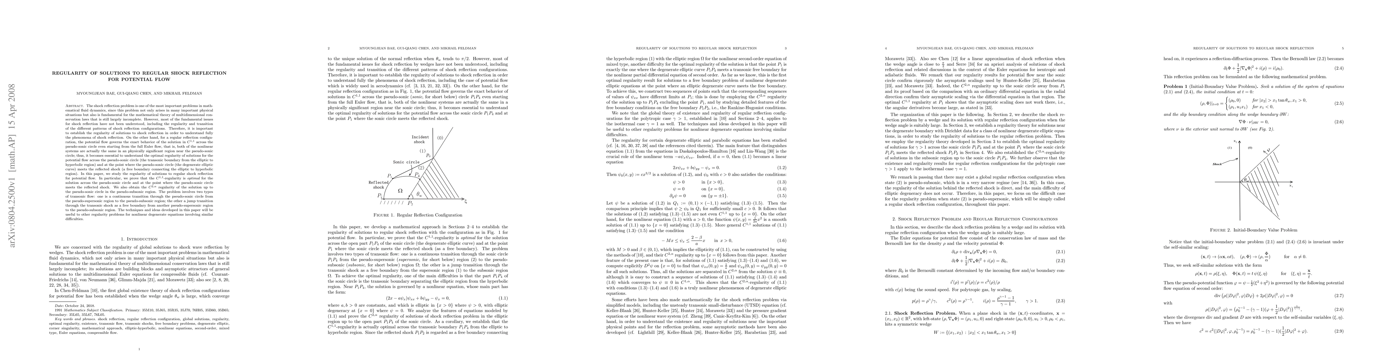 The shock reflection problem is one of the most important problems in mathematical fluid dynamics, since this problem not only arises in many important physical situations but also is fundamental for the theory of multidimensional conservation laws. However, most of the fundamental issues for shock reflection have not been understood. Therefore, it is important to establish the regularity of solutions to shock reflection in order to understand fully the phenomena of shock reflection. On the other hand, for a regular reflection configuration, the potential flow governs the exact behavior of the solution in $C^{1,1}$ across the pseudo-sonic circle even starting from the full Euler flow, that is, both of the nonlinear systems are actually the same in an physically significant region near the pseudo-sonic circle; thus, it becomes essential to understand the optimal regularity of solutions for the potential flow across the pseudo-sonic circle and at the point where the pseudo-sonic circle meets the reflected shock. In this paper, we study the regularity of solutions to regular shock reflection for potential flow. In particular, we prove that the $C^{1,1}$-regularity is optimal for the solution across the pseudo-sonic circle and at the point where the pseudo-sonic circle meets the reflected shock. We also obtain the $C^{2,\alpha}$ regularity of the solution up to the pseudo-sonic circle in the pseudo-subsonic region. The problem involves two types of transonic flow: one is a continuous transition through the pseudo-sonic circle from the pseudo-supersonic region to the pseudo-subsonic region; the other a jump transition through the transonic shock as a free boundary from another pseudo-supersonic region to the pseudo-subsonic region.