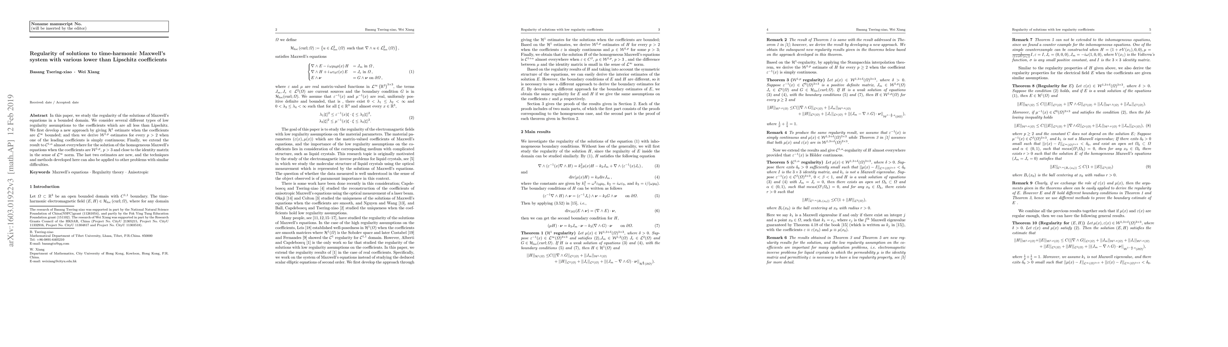 This paper investigates the regularity of solutions to time-harmonic Maxwell's equations under various low regularity coefficient assumptions, developing new $\mathcal{H}^1$ and $\mathcal{W}^{1,p}$ estimates for different coefficient types, and extending results to $\mathcal{C}^{1,\alpha}$ for homogeneous cases. The techniques developed are applicable to other similar problems.