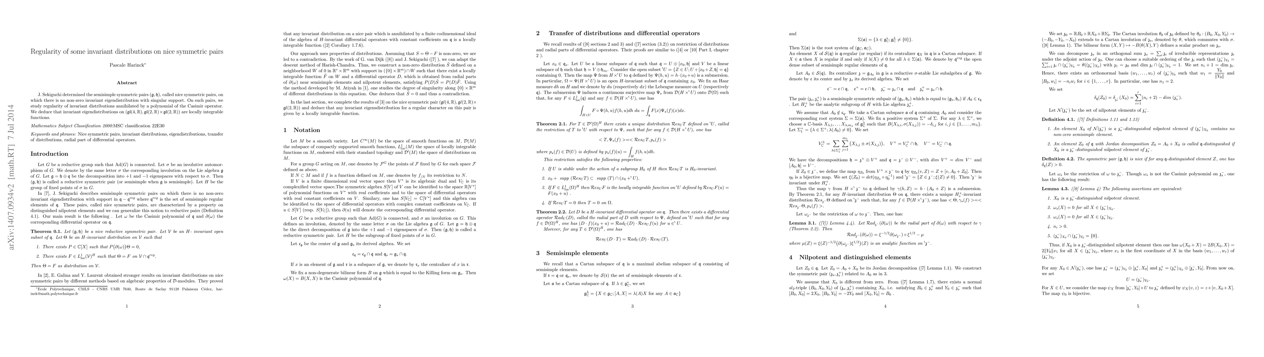 J.~Sekiguchi determined the semisimple symmetric pairs (g,h), called nice symmetric pairs, on which there is no non-zero invariant eigendistribution with singular support. On such pairs, we study regularity of invariant distributions annihilated by a polynomial of the Casimir operator. We deduce that invariant eigendistributions on (gl(4,R),gl(2,R)*gl(2,R)) are locally integrable functions.