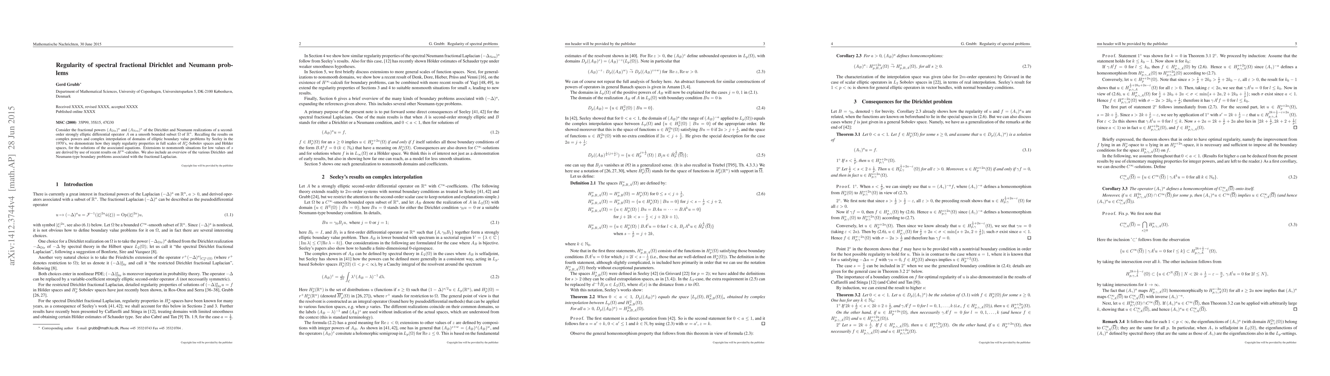 This paper investigates the regularity properties of solutions to fractional Dirichlet and Neumann problems for a second-order elliptic operator, leveraging Seeley's results on complex powers and interpolation. It extends these findings to $H^s_p$-Sobolev and H\"older spaces, and discusses extensions to nonsmooth domains using $H^\infty$-calculus.