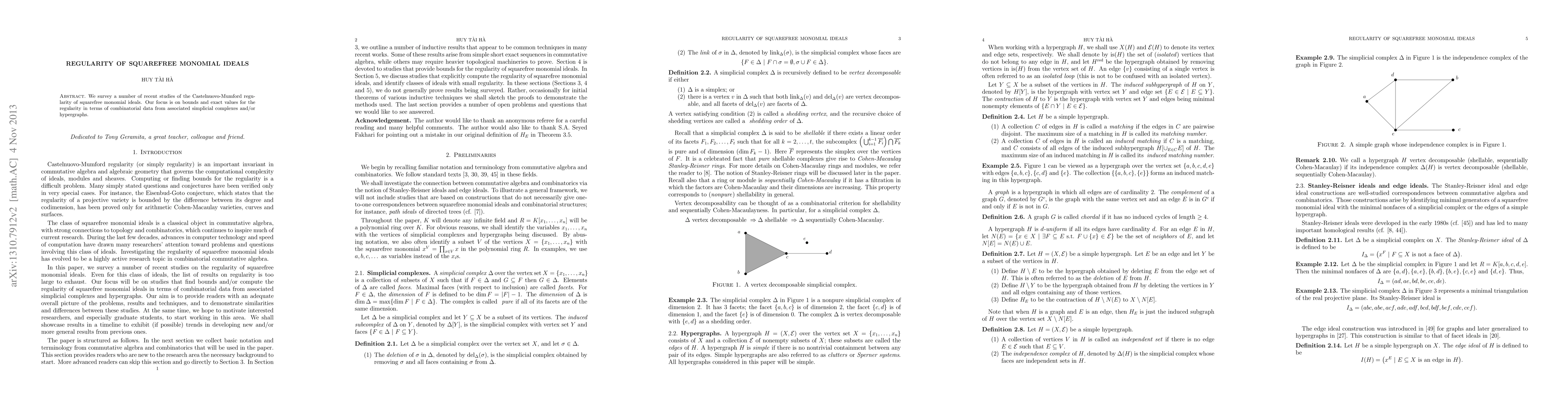 The paper surveys recent studies on the Castelnuovo-Mumford regularity of squarefree monomial ideals, focusing on bounds and exact values for regularity in terms of combinatorial data from associated simplicial complexes and hypergraphs.