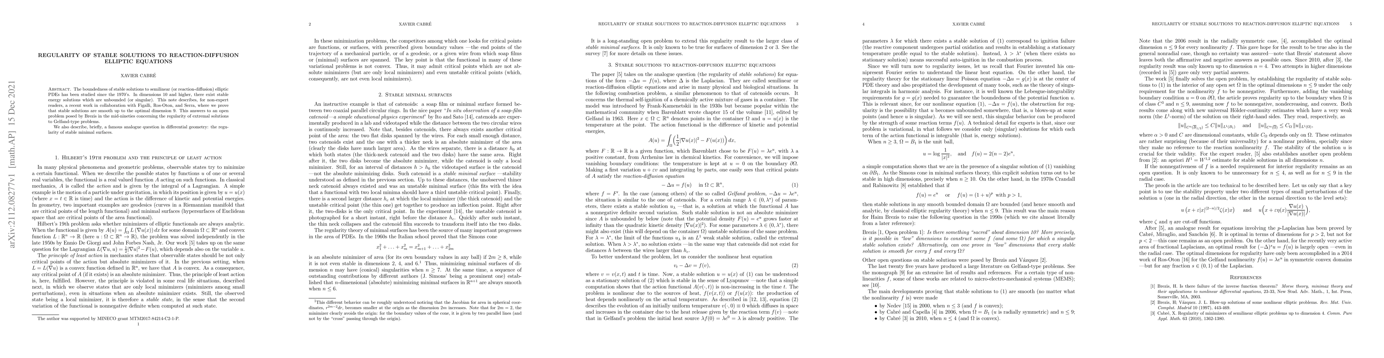 The boundedness of stable solutions to semilinear (or reaction-diffusion) elliptic PDEs has been studied since the 1970's. In dimensions 10 and higher, there exist stable energy solutions which are unbounded (or singular). This note describes, for non-expert readers, a recent work in collaboration with Figalli, Ros-Oton, and Serra, where we prove that stable solutions are smooth up to the optimal dimension 9. This answers to an open problem posed by Brezis in the mid-nineties concerning the regularity of extremal solutions to Gelfand-type problems. We also describe, briefly, a famous analogue question in differential geometry: the regularity of stable minimal surfaces.