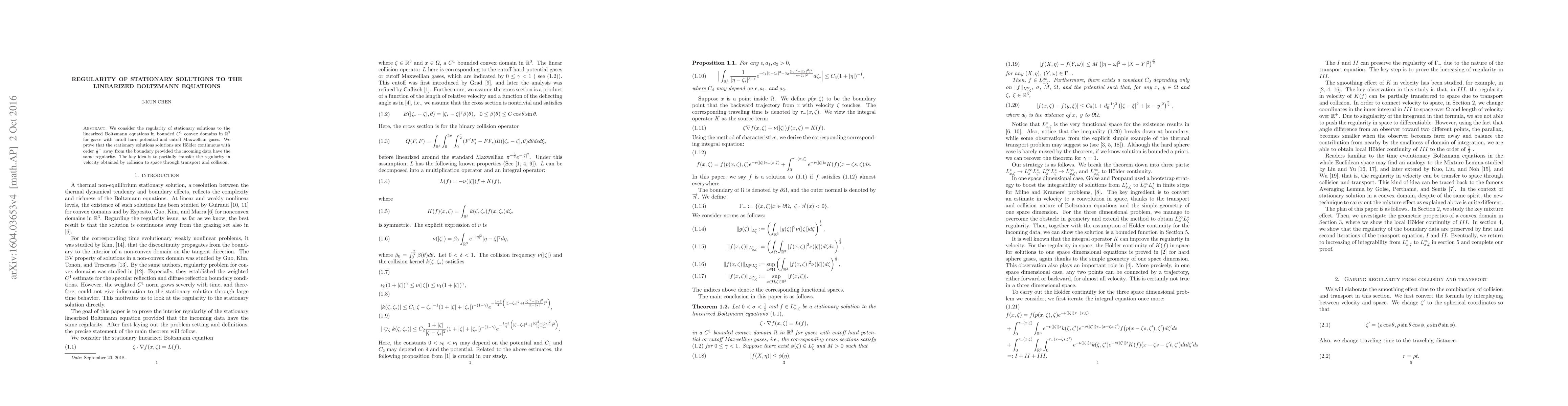 This paper proves the Hölder continuity of stationary solutions to the linearized Boltzmann equations in bounded convex domains, showing that solutions maintain regularity away from the boundary, provided the incoming data are similarly regular. The key method involves transferring velocity regularity to spatial regularity via transport and collision processes.