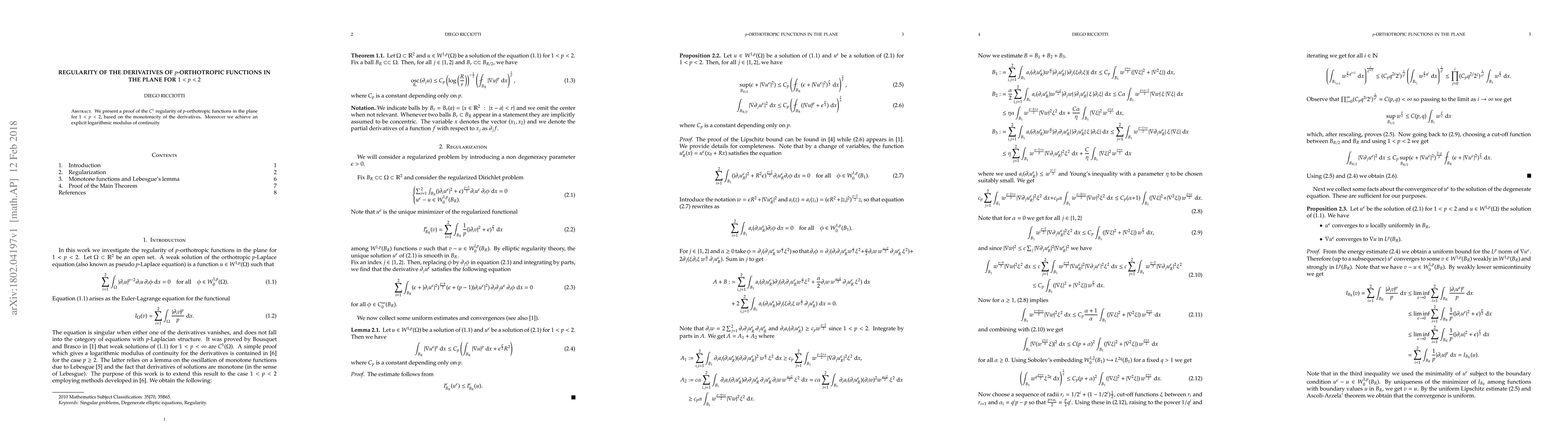 This paper proves that $p$-orthotropic functions in the plane have $C^1$ regularity for $1<p<2$, with an explicit logarithmic modulus of continuity, based on the monotonicity of their derivatives.