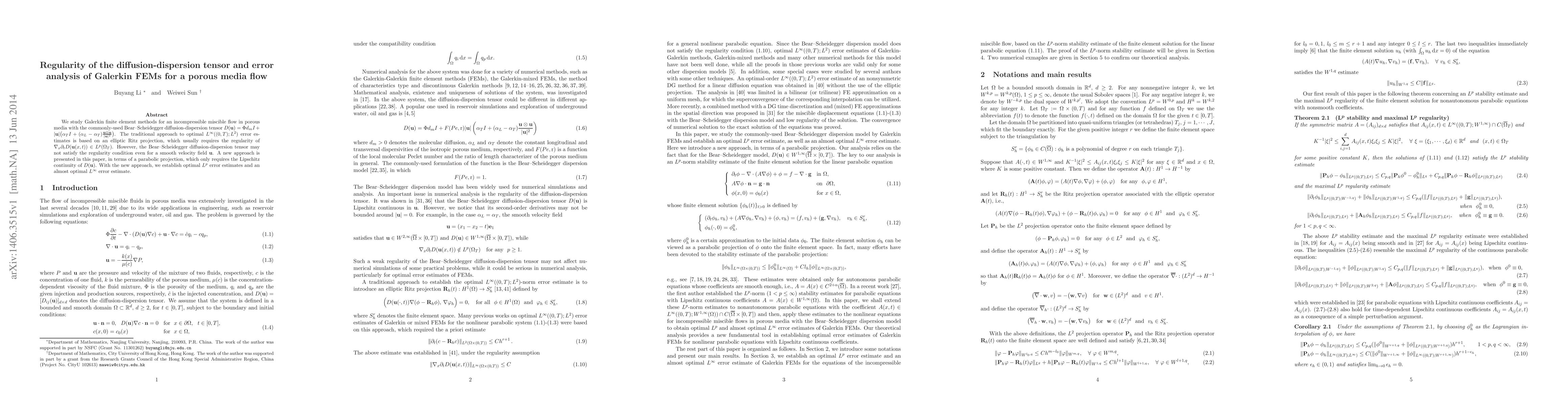 This paper investigates Galerkin finite element methods for modeling incompressible miscible flow in porous media, focusing on the Bear-Scheidegger diffusion-dispersion tensor. It proposes a new parabolic projection method that achieves optimal error estimates without requiring the traditional regularity conditions, instead relying on Lipschitz continuity.