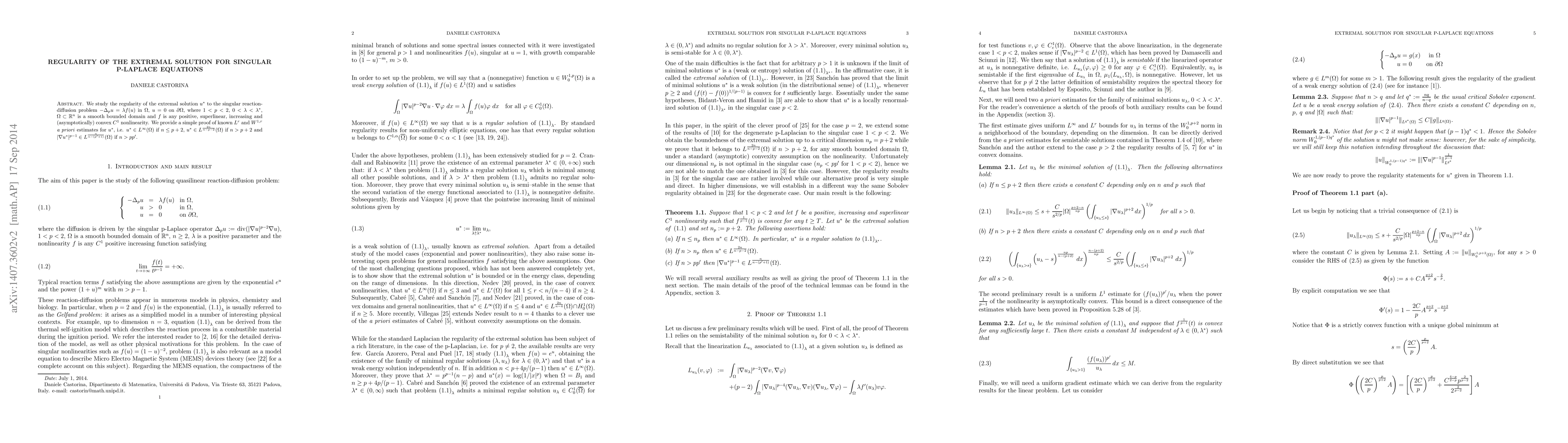 This paper investigates the regularity of the extremal solution $u^*$ to singular p-Laplace equations, proving $L^r$ and $W^{1,r}$ a priori estimates, showing that $u^* \in L^\infty(\Omega)$ for $n \leq p+2$ and $|\nabla u^*|^{p-1} \in L^{\frac{n}{n-(p'+1)}} (\Omega)$ for $n > p p'$.