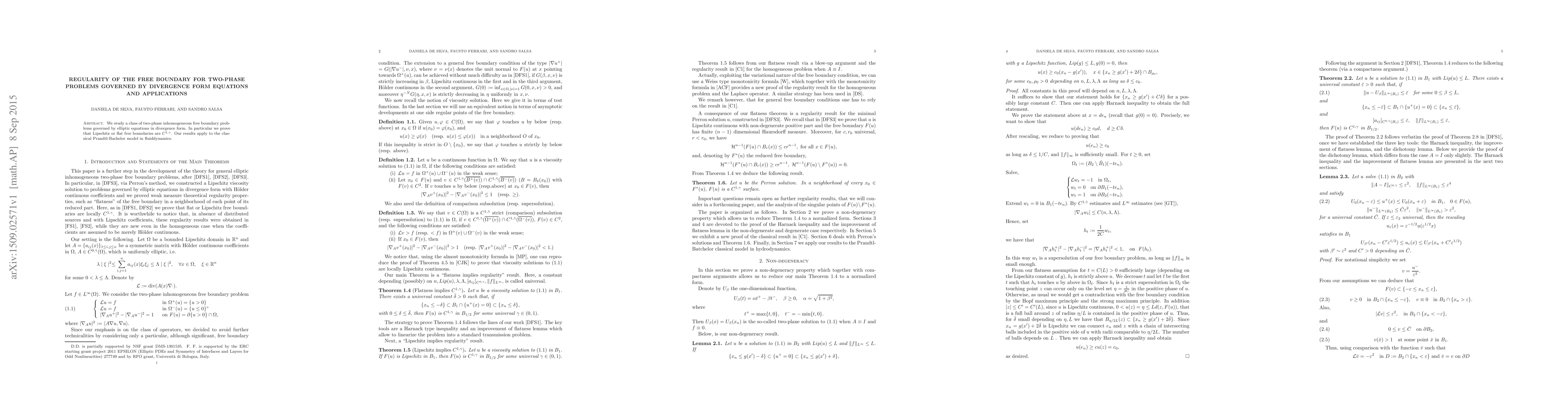 Summary: This paper investigates the regularity of free boundaries in two-phase problems governed by elliptic divergence form equations, proving that Lipschitz or flat boundaries are $C^{1,\gamma}$. The findings are applied to the classical Prandtl-Bachelor model in fluid dynamics.