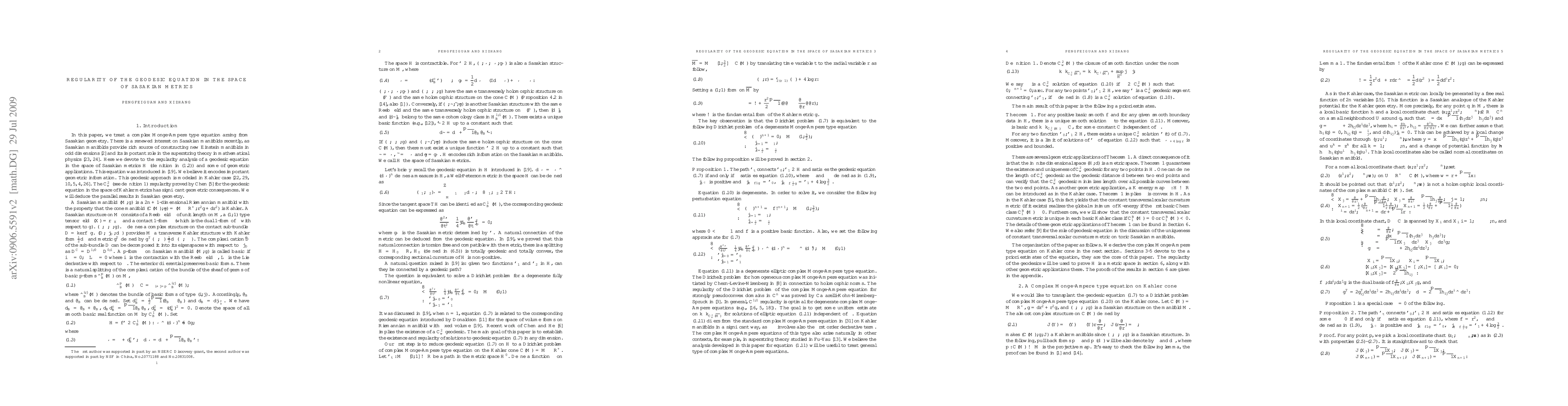This paper is devoted to the regularity analysis of a geodesic equation in the space of Sasakian metrics. Firstly, we reduce the geodesic equation in the space of Sasakian metrics to a Dirichlet problem of degenerate complex Monge-Amp\'ere type eqution on the K\"ahler cone; secondly, we obtain a priori etimates for the above equation. These a priori estimates guarantee the existence and uniqueness of $C^{2}_{w}$ geodesic for any two points in the space of Sasakian metrics. We also give some geometric applications of the above estimates in the end of this paper.