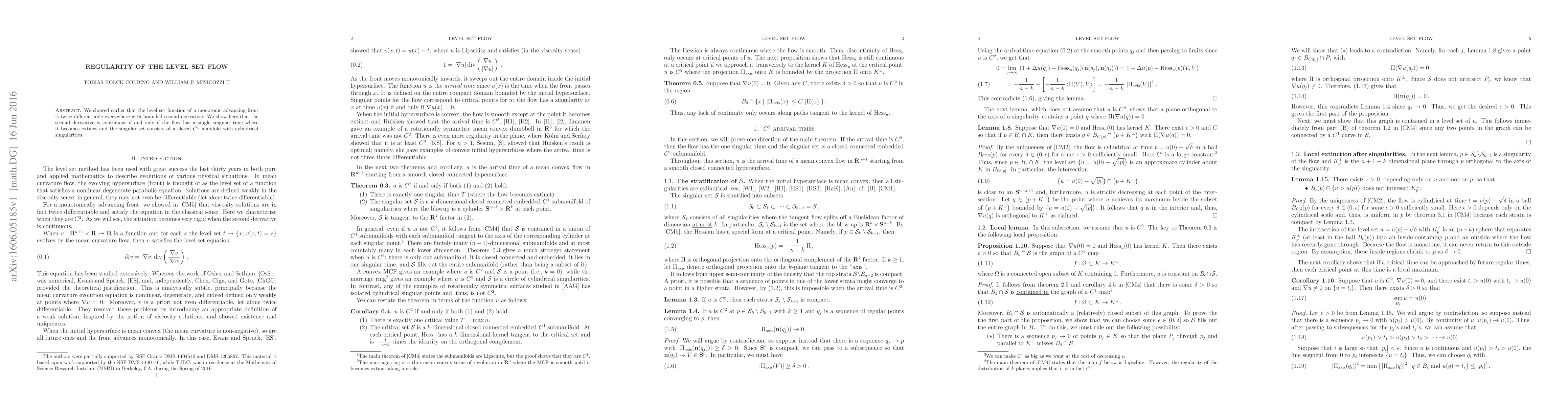 The level set flow of a monotonic advancing front is twice differentiable everywhere with a continuous second derivative if the flow has a single singular time where it becomes extinct, resulting in a closed C^1 manifold with cylindrical singularities.
