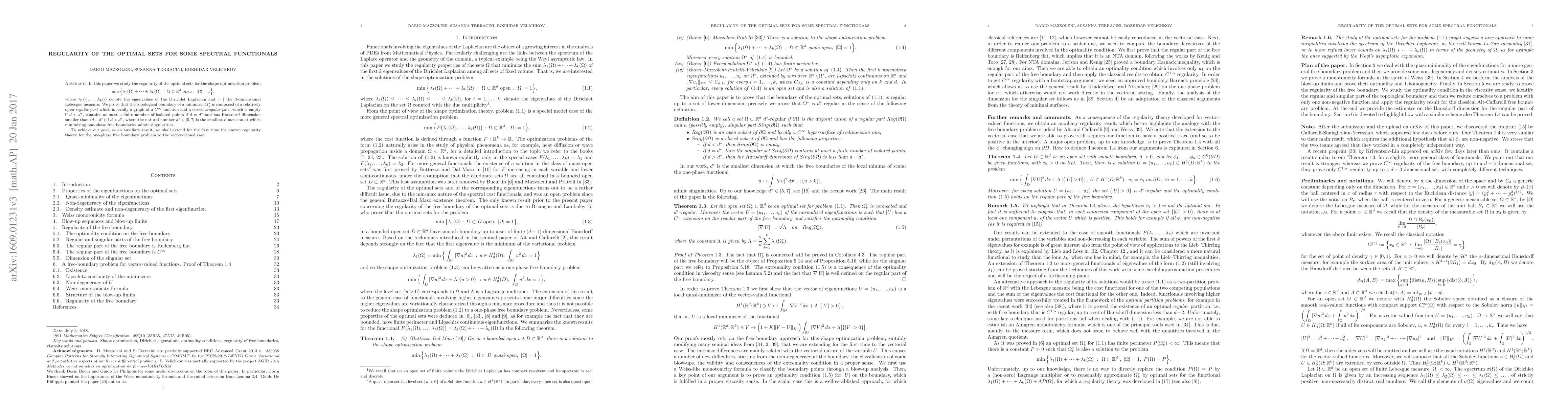 This paper investigates the regularity of optimal sets in shape optimization involving the sum of the first $k$ eigenvalues of the Dirichlet Laplacian. It proves that the boundary of the optimal set consists of a regular part and a singular part, with specific properties depending on the dimension $d$.