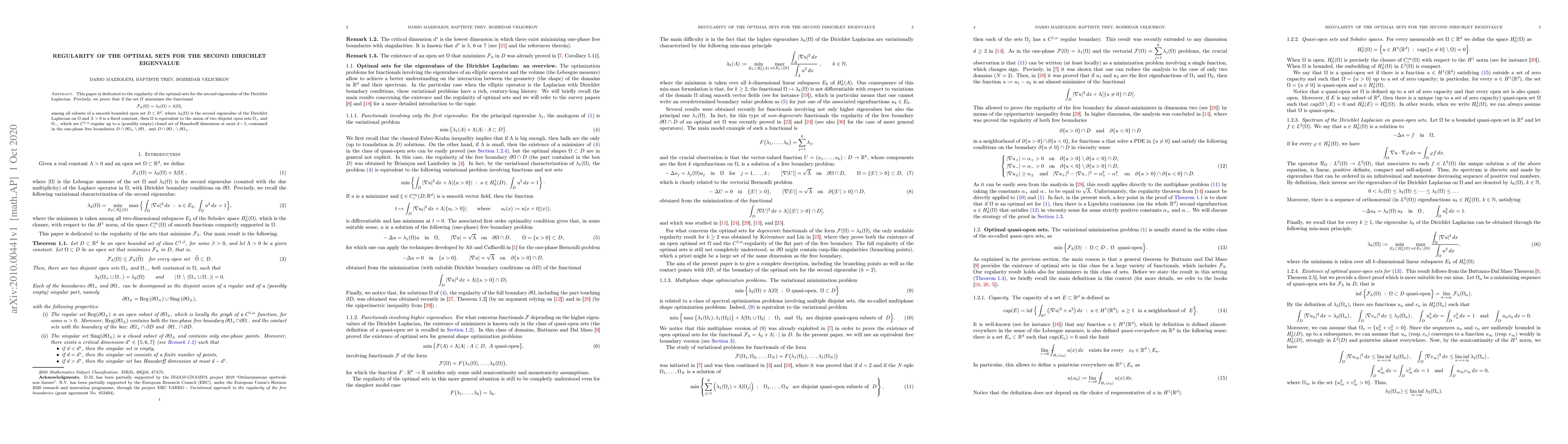 This paper proves that if a set minimizes a functional involving the second Dirichlet eigenvalue, it can be decomposed into two disjoint open sets with specific regularity properties.