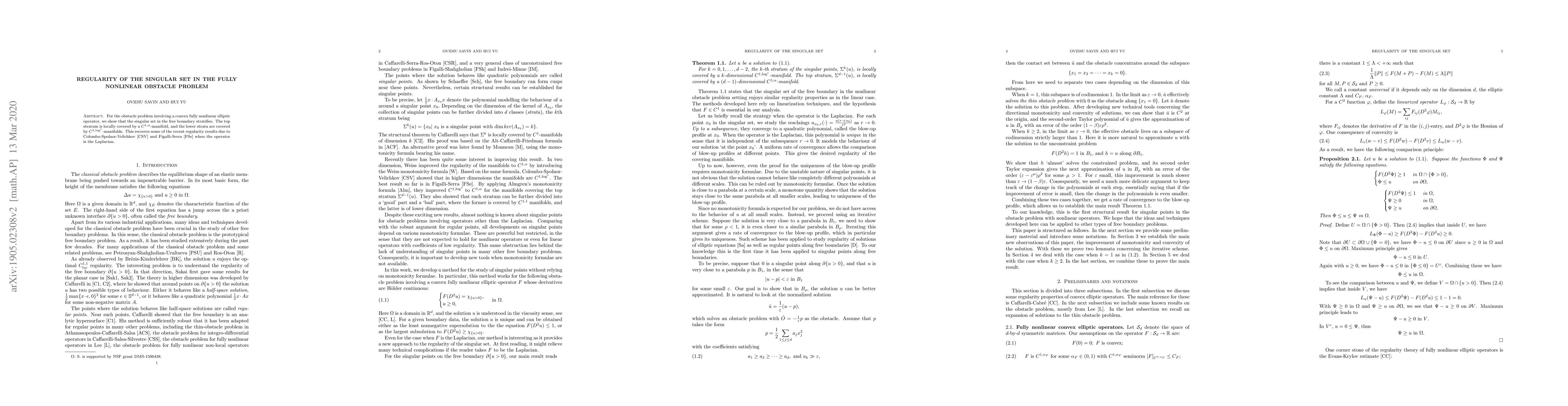 This paper demonstrates that the singular set in the fully nonlinear obstacle problem stratifies, with the top stratum locally covered by a $C^{1,\alpha}$-manifold, and lower strata by $C^{1,\log^\varepsilon}$-manifolds, extending the regularity results previously found for the Laplacian operator.