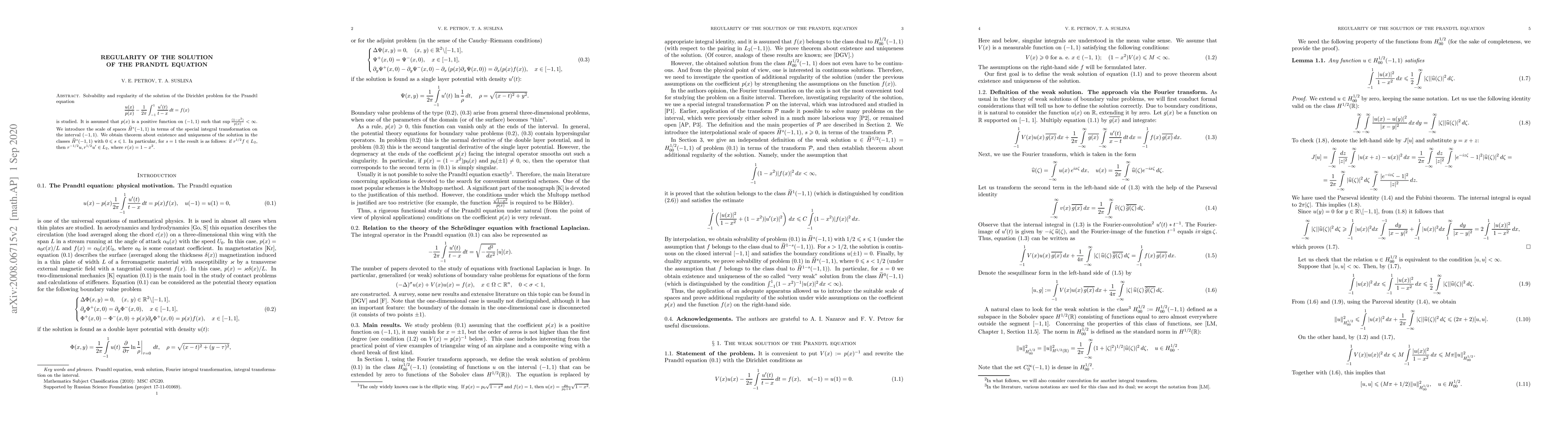 Solvability and regularity of the solution of the Dirichlet problem for the Prandtl equation $$ {u(x)\over p(x)}- {1\over 2\pi}\int_{-1}^1 {u'(t) \over t-x} \,dt = f(x) $$ is studied. It is assumed that $p(x)$ is a positive function on $(-1,1)$ such that $\sup \frac{(1-x^2)}{ p(x)} < \infty$. We introduce the scale of spaces $\widetilde{H}^s(-1,1)$ in terms of the special integral transformation on the interval $(-1,1)$. We obtain theorem about existence and uniqueness of the solution in the classes $\widetilde{H}^{s}(-1,1)$ with $0\le s \le 1$. In particular, for $s=1$ the result is as follows: if $r^{1/2} f \in L_2$, then $r^{-1/2} u, r^{1/2} u' \in L_2$, where $r(x)=1-x^2$.