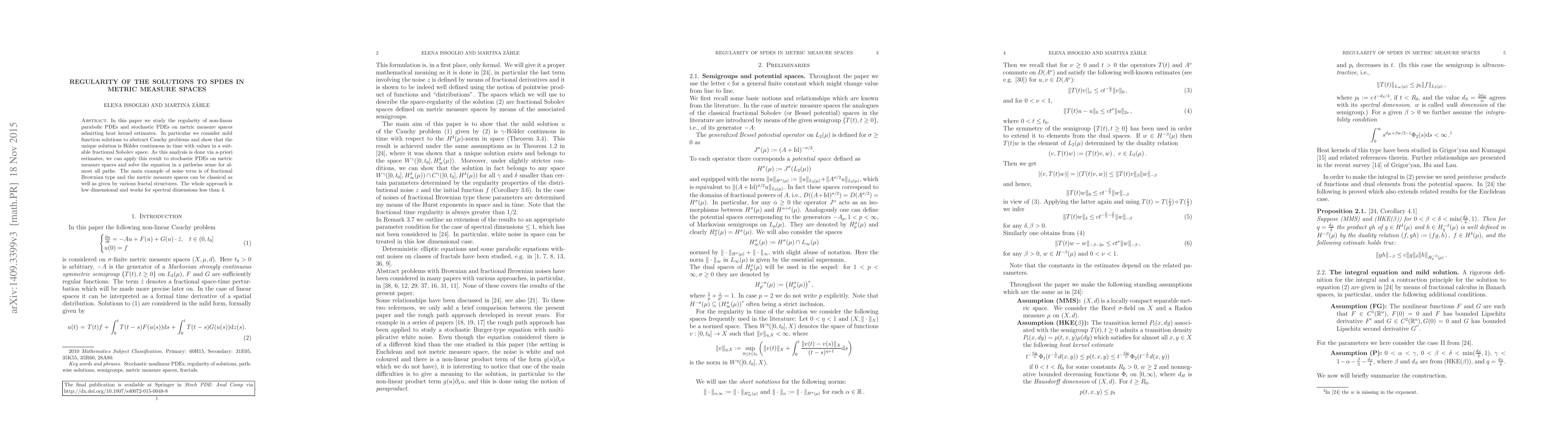 In this paper we study the regularity of non-linear parabolic PDEs and stochastic PDEs on metric measure spaces admitting heat kernels. In particular we consider mild function solutions to abstract Cauchy problems and show that the unique solution is H\"older continuous in time with values in a suitable fractional Sobolev space. As this analysis is done via a-priori estimates, we can apply this result to stochastic PDEs on metric measure spaces and solve the equation in a pathwise sense for almost all paths. The main example of noise term is of fractional Brownian type and the metric measure spaces can be classical as well as given by various fractal structures. The whole approach is low dimensional and works for spectral dimensions less than 4.