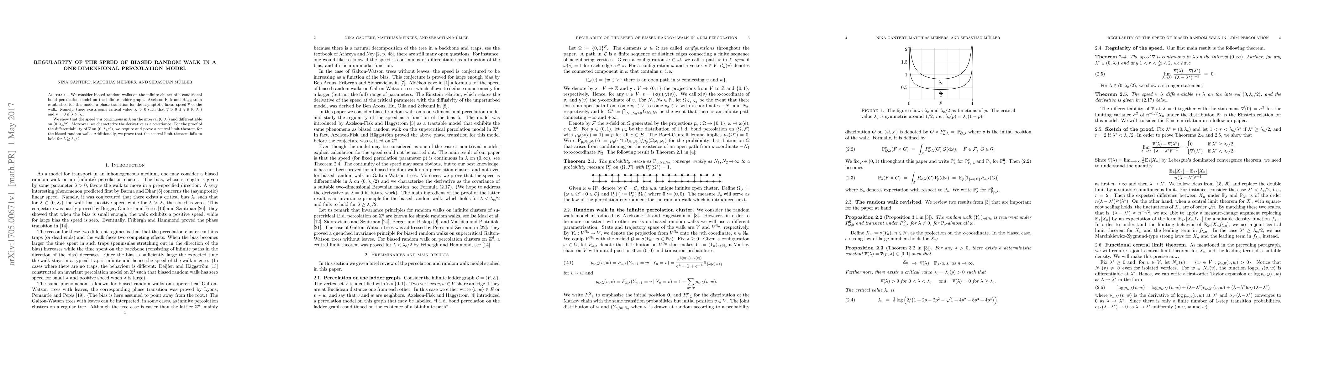 This paper investigates the regularity of the speed of biased random walks in a one-dimensional percolation model on an infinite ladder graph, showing that the speed is continuous and differentiable up to a critical value, with the derivative characterized as a covariance. The differentiability proof relies on a central limit theorem for the biased random walk, which does not hold beyond this critical value.
