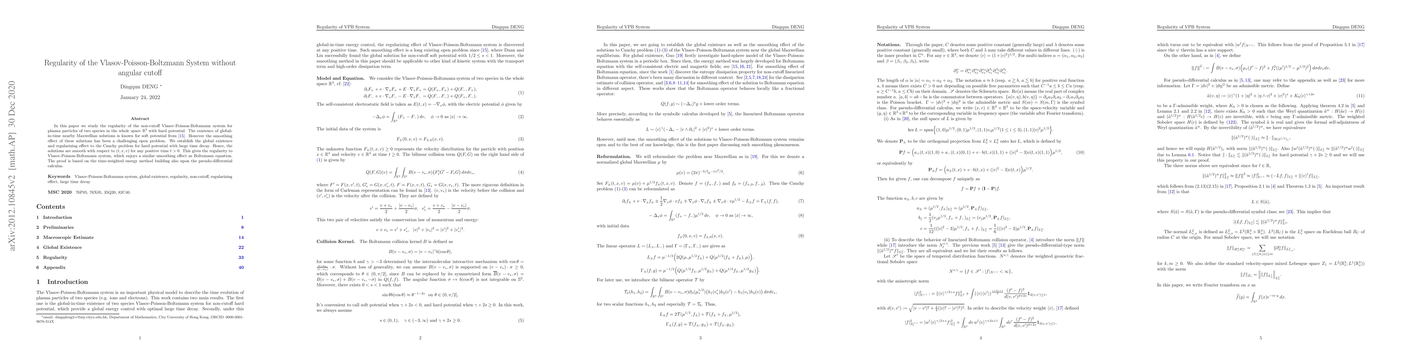 In this paper we study the regularity of the non-cutoff Vlasov-Poisson-Boltzmann system for plasma particles of two species in the whole space $\mathbb{R}^3$ with hard potential. The existence of global-in-time nearby Maxwellian solutions is known for soft potential from [15]. However the smoothing effect of these solutions has been a challenging open problem. We establish the global existence and regularizing effect to the Cauchy problem for hard potential with large time decay. Hence, the solutions are smooth with respect to $(t,x,v)$ for any positive time $t>0$. This gives the regularity to Vlasov-Poisson-Boltzmann system, which enjoys a similar smoothing effect as Boltzmann equation. The proof is based on the time-weighted energy method building also upon the pseudo-differential calculus.