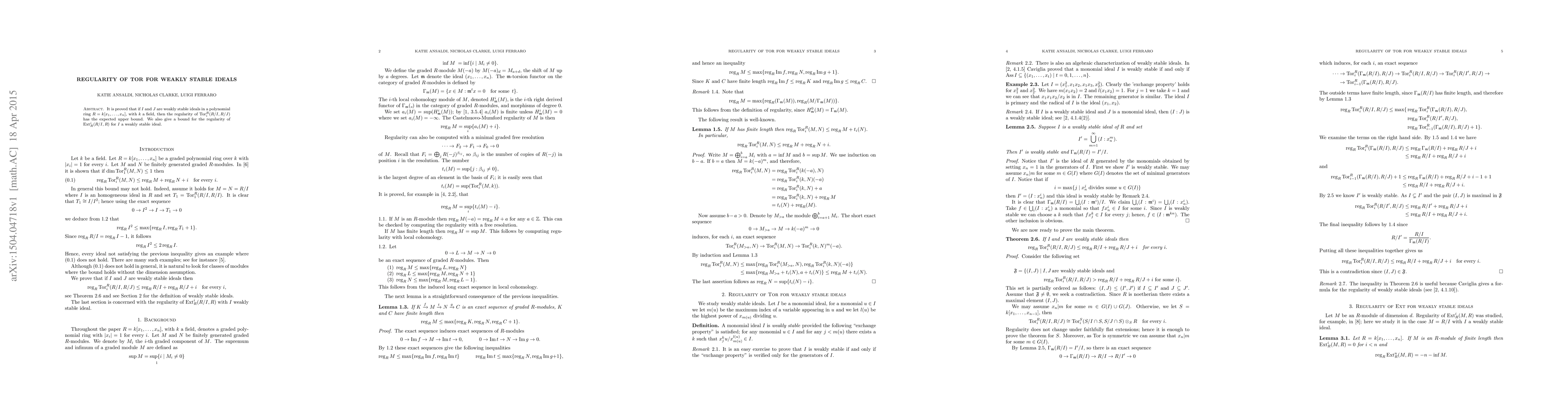Summary: The paper proves that the regularity of $\text{Tor}^R_i(R/I,R/J)$ for weakly stable ideals $I$ and $J$ in a polynomial ring $R$ is bounded as expected. Additionally, it provides a bound for the regularity of $\text{Ext}_R^i(R/I,R)$ when $I$ is a weakly stable ideal.