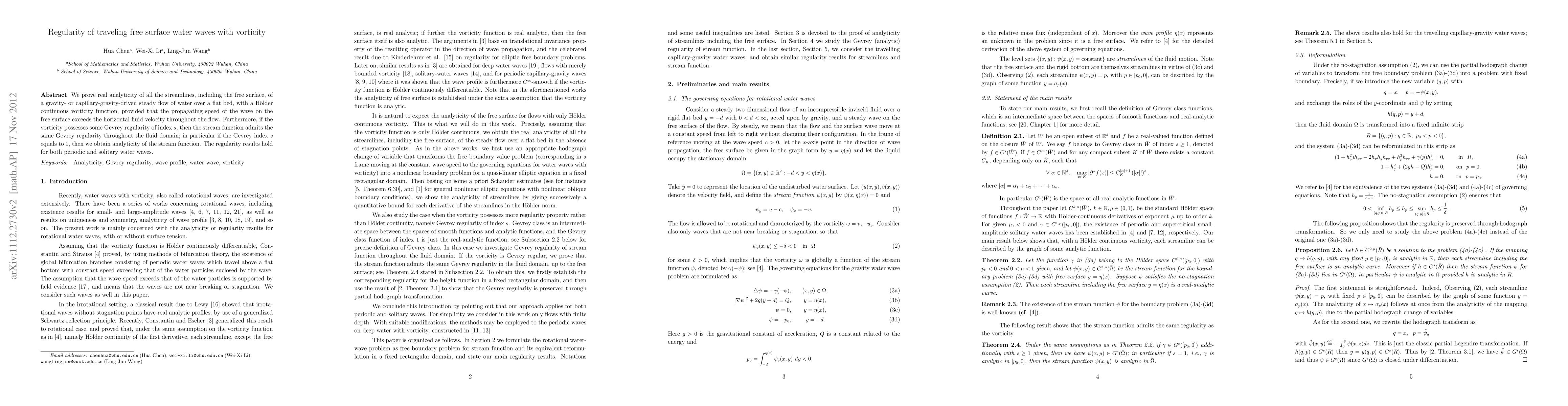 This paper proves real analyticity of streamlines and the free surface in steady water waves driven by gravity or capillary forces, given certain conditions on wave speed and vorticity. It also shows that Gevrey regularity of vorticity translates to Gevrey regularity of the stream function, with analyticity achieved when the vorticity has Gevrey index 1.
