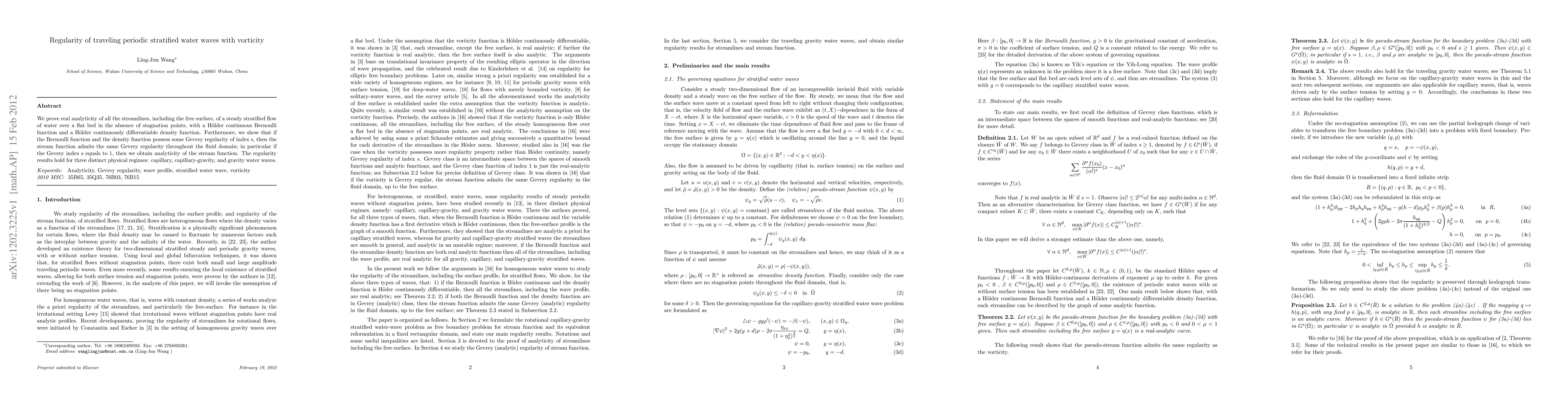The paper presents a rigorous mathematical proof of the real analyticity of streamlines and the stream function for stratified water waves with vorticity, extending previous results to include Gevrey regularity and various physical regimes.