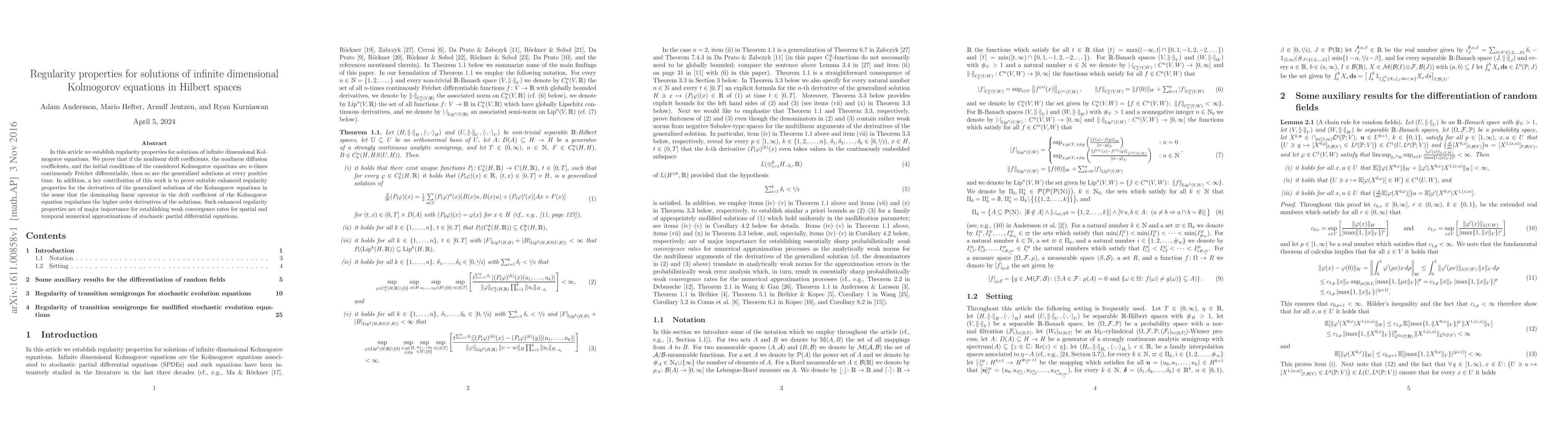 This paper establishes regularity properties for solutions of infinite-dimensional Kolmogorov equations in Hilbert spaces, proving that generalized solutions maintain $n$-times Fréchet differentiability if the coefficients and initial conditions are similarly differentiable. It also demonstrates enhanced regularity for higher-order derivatives, crucial for weak convergence rates in numerical approximations of stochastic partial differential equations.
