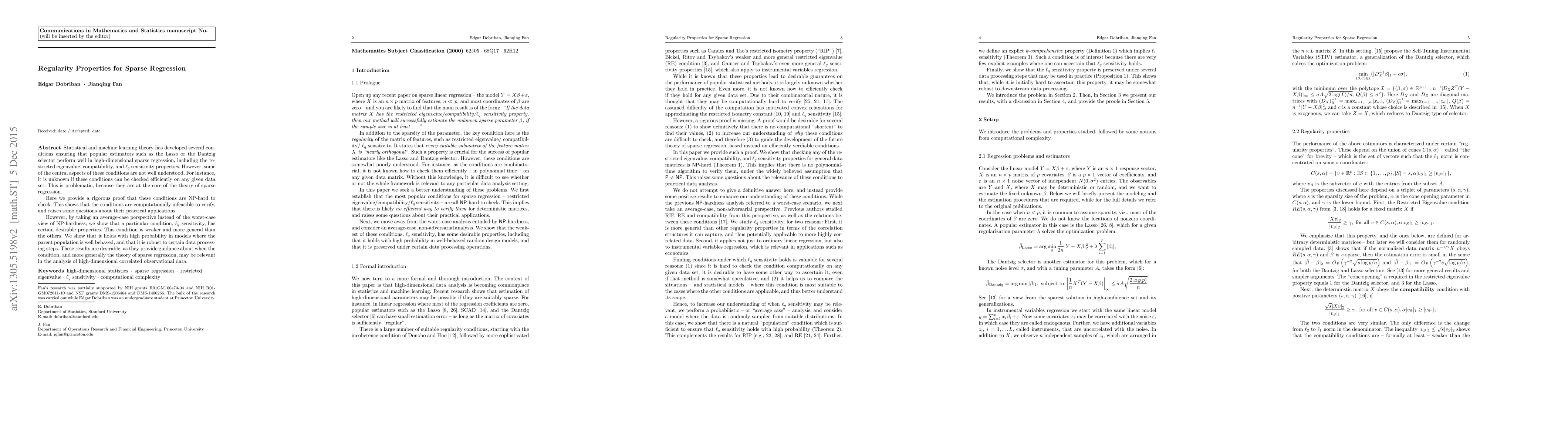 Statistical and machine learning theory has developed several conditions ensuring that popular estimators such as the Lasso or the Dantzig selector perform well in high-dimensional sparse regression, including the restricted eigenvalue, compatibility, and $\ell_q$ sensitivity properties. However, some of the central aspects of these conditions are not well understood. For instance, it is unknown if these conditions can be checked efficiently on any given data set. This is problematic, because they are at the core of the theory of sparse regression. Here we provide a rigorous proof that these conditions are NP-hard to check. This shows that the conditions are computationally infeasible to verify, and raises some questions about their practical applications. However, by taking an average-case perspective instead of the worst-case view of NP-hardness, we show that a particular condition, $\ell_q$ sensitivity, has certain desirable properties. This condition is weaker and more general than the others. We show that it holds with high probability in models where the parent population is well behaved, and that it is robust to certain data processing steps. These results are desirable, as they provide guidance about when the condition, and more generally the theory of sparse regression, may be relevant in the analysis of high-dimensional correlated observational data.