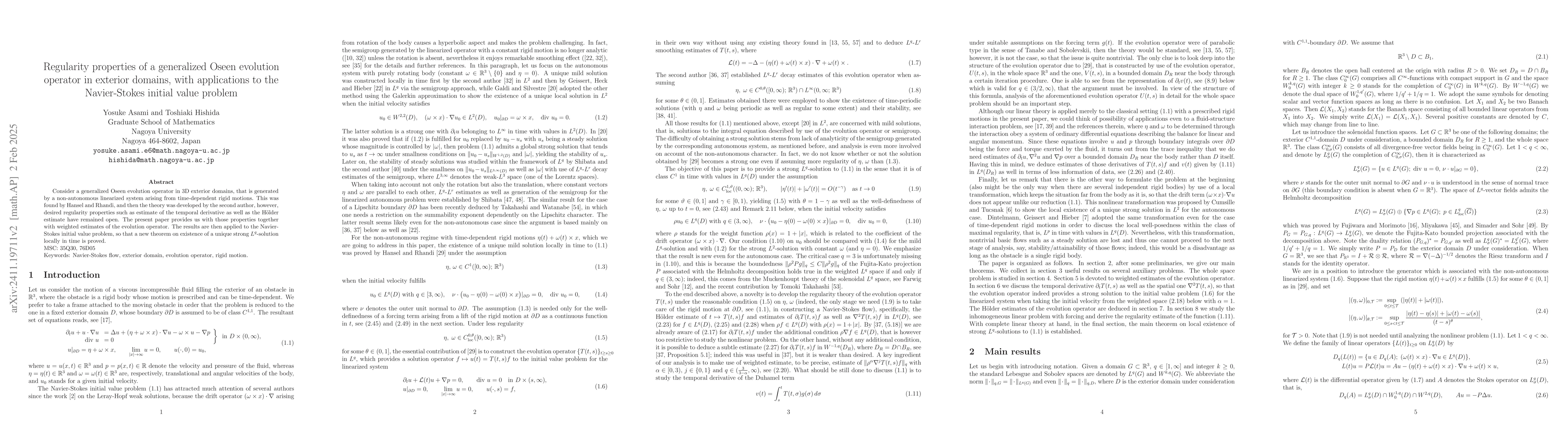 The paper establishes regularity properties for a generalized Oseen evolution operator in 3D exterior domains, including temporal derivative and Hölder estimates. It applies these results to the Navier-Stokes problem, proving a new theorem on the existence of a unique strong Lq-solution locally in time.