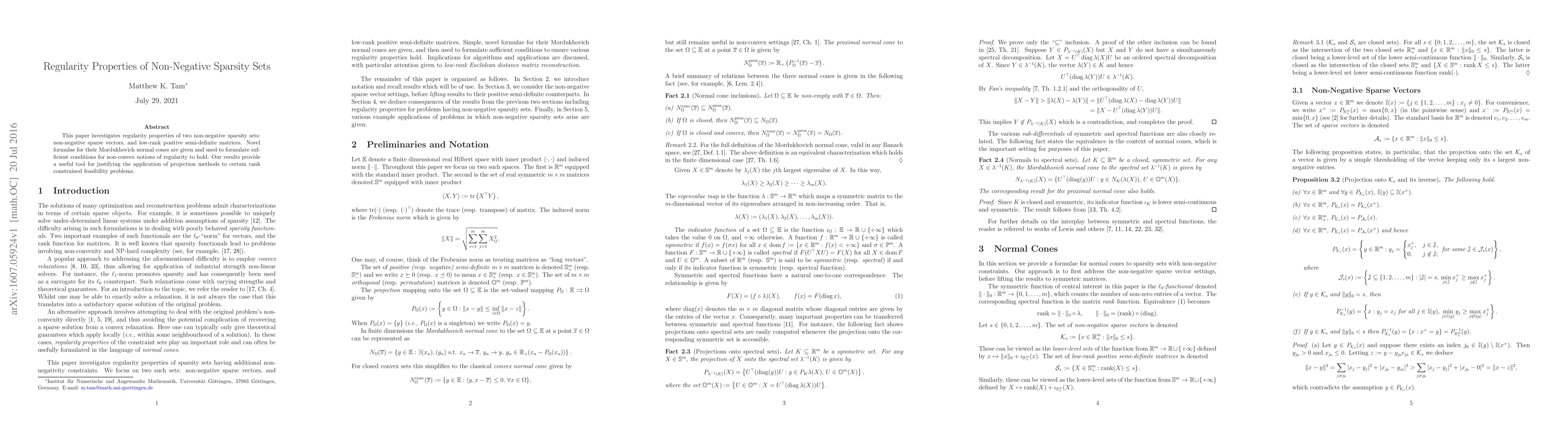 This paper investigates regularity properties of two non-negative sparsity sets: non-negative sparse vectors, and low-rank positive semi-definite matrices. Novel formulae for their Mordukhovich normal cones are given and used to formulate sufficient conditions for non-convex notions of regularity to hold. Our results provide a useful tool for justifying the application of projection methods to certain rank constrained feasibility problems.
