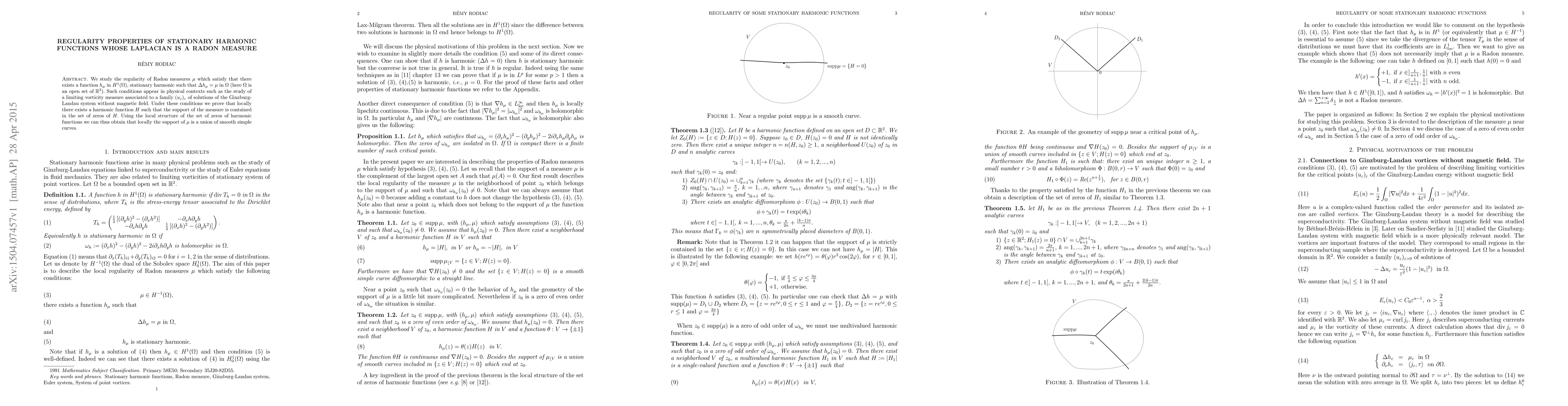 We study the regularity of Radon measures $\mu$ which satisfy that there exists a function $h_\mu$ in $H^1(\Omega)$, stationary harmonic such that $\Delta h_\mu =\mu$ in $\Omega$ (here $\Omega$ is an open set of $\mathbb{R}^2$). Such conditions appear in physical contexts such as the study of a limiting vorticity measure associated to a family $(u_\varepsilon)_\varepsilon$ of solutions of the Ginzburg-Landau system without magnetic field. Under these conditions we prove that locally there exists a harmonic function $H$ such that the support of the measure is contained in the set of zeros of $H$. Using the local structure of the set of zeros of harmonic functions we can thus obtain that locally the support of $\mu$ is a union of smooth simple