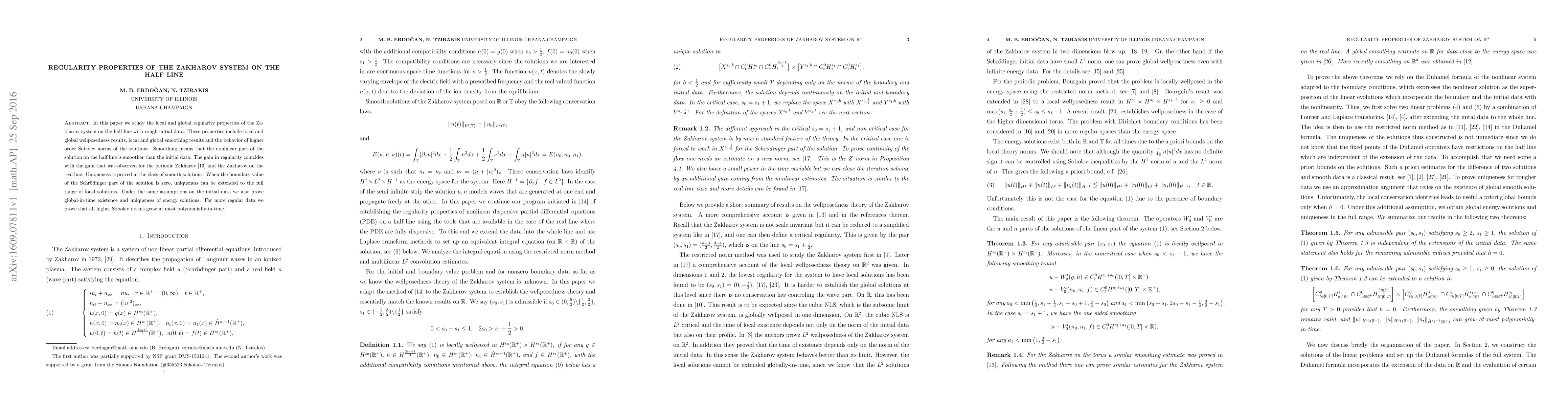 The research paper investigates the regularity properties of the Zakharov system on the half line, including local and global wellposedness, smoothing results, and uniqueness of solutions, with implications for understanding non-linear wave equations.