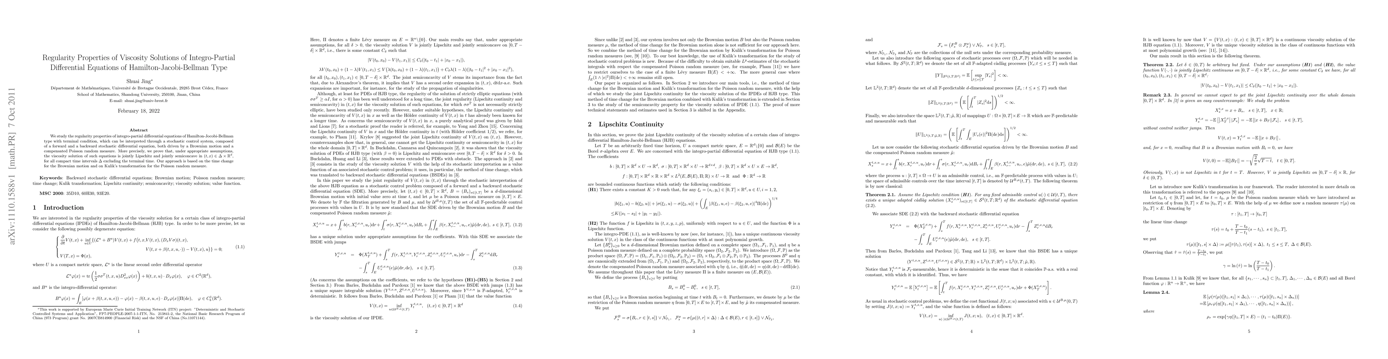 This paper investigates the regularity properties of viscosity solutions for integro-partial differential equations of Hamilton-Jacobi-Bellman type, proving joint Lipschitz and semiconcavity under specific conditions. The analysis leverages time change for Brownian motion and Kulik's transformation for Poisson random measures.