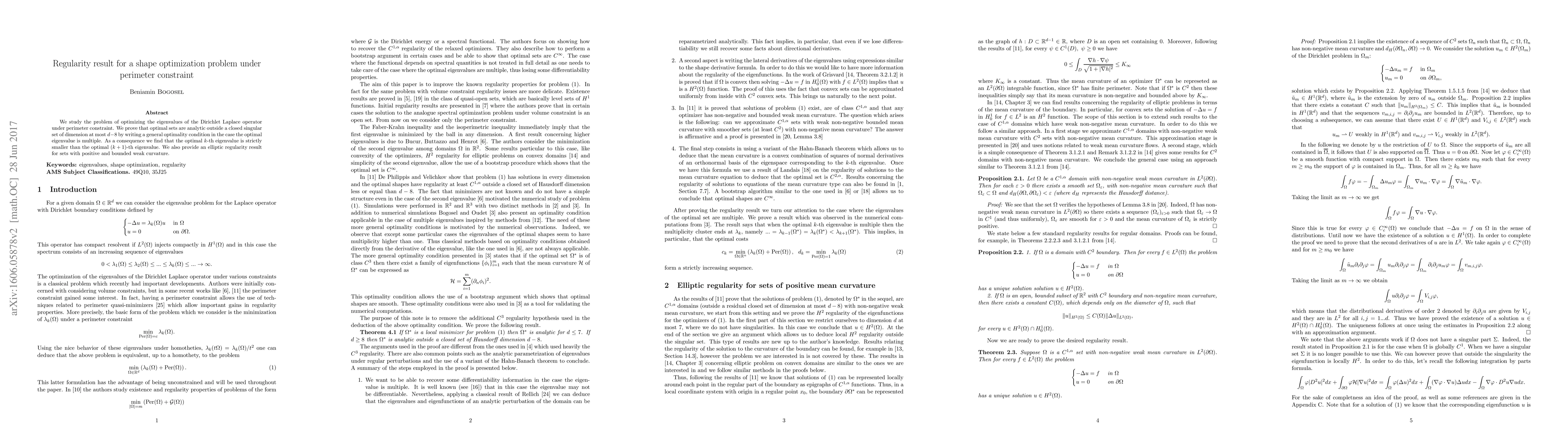 The paper establishes analyticity results for optimal shapes in shape optimization problems, extending previous work on eigenvalue problems with perimeter constraints.