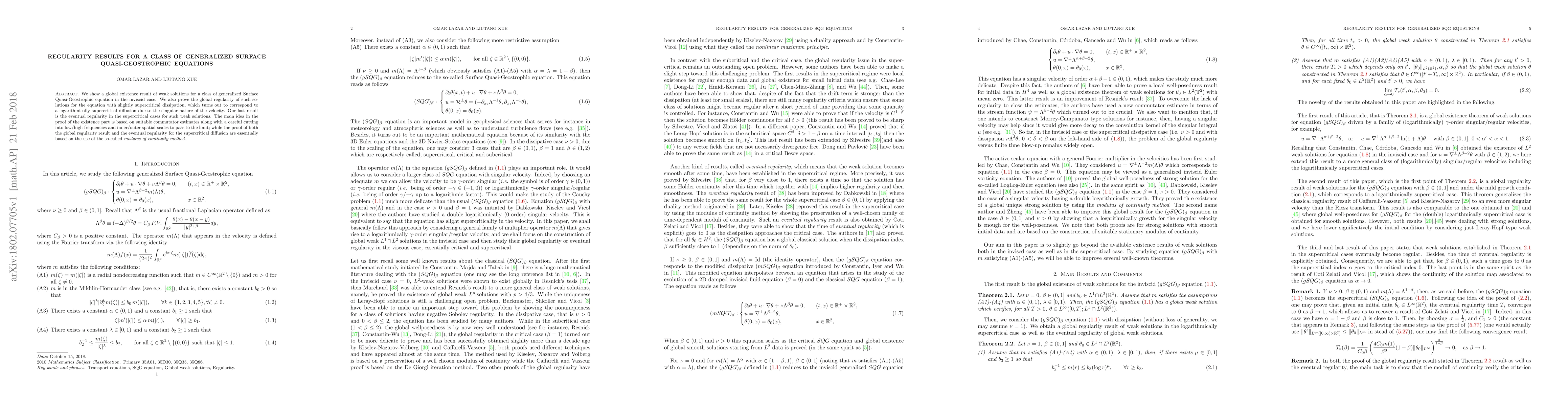 This paper establishes global existence and regularity for weak solutions of a generalized Surface Quasi-Geostrophic equation in the inviscid case, utilizing commutator estimates and frequency decomposition. It also proves global regularity for slightly supercritical dissipation and eventual regularity for supercritical diffusion, employing the modulus of continuity method.