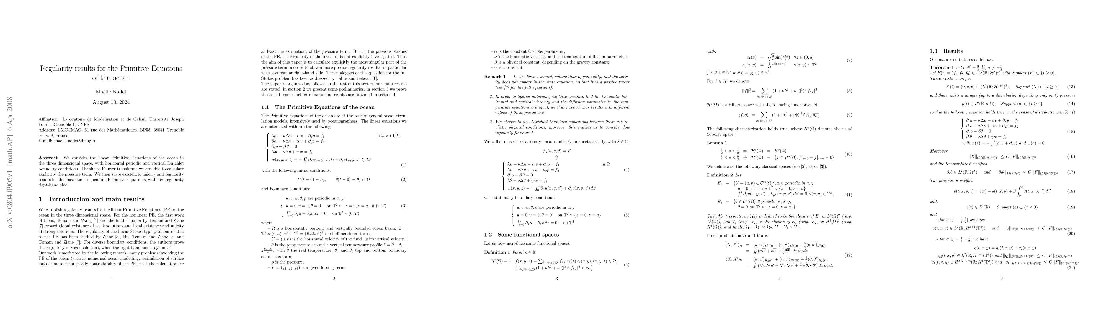 This paper investigates the linear Primitive Equations of the ocean, deriving explicit pressure calculations via Fourier transforms. It establishes existence, uniqueness, and regularity results for these equations under low-regularity conditions.