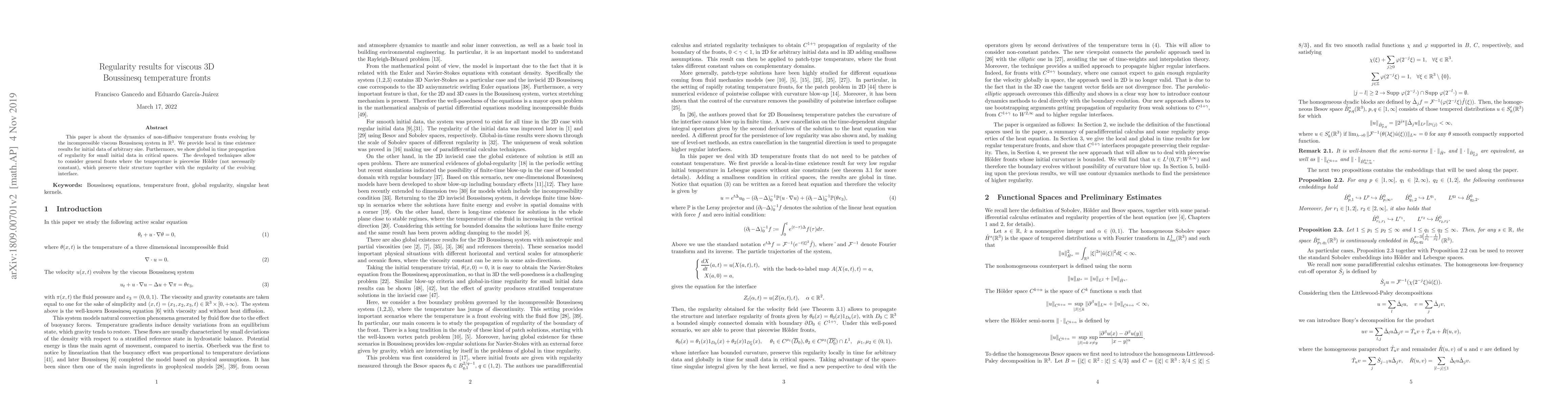 This paper is about the dynamics of non-diffusive temperature fronts evolving by the incompressible viscous Boussinesq system in $\mathbb{R}^3$. We provide local in time existence results for initial data of arbitrary size. Furthermore, we show global in time propagation of regularity for small initial data in critical spaces. The developed techniques allow to consider general fronts where the temperature is piecewise H\"older (not necessarily constant), which preserve their structure together with the regularity of the evolving interface.