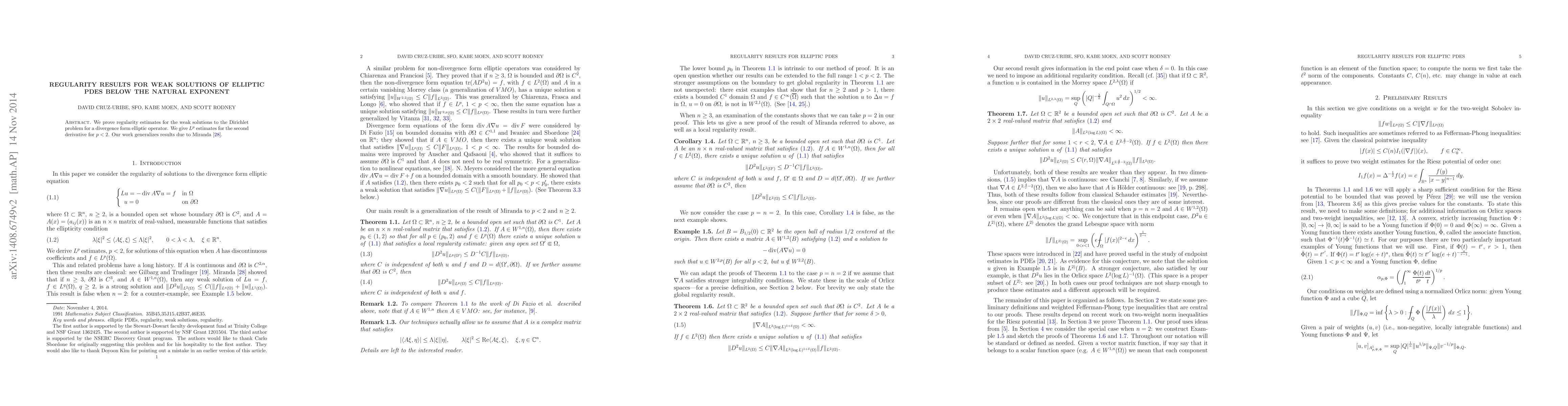 This paper proves regularity estimates for weak solutions to the Dirichlet problem of a divergence form elliptic operator, providing $L^p$ estimates for the second derivative for $p<2$. The work generalizes earlier results established by Miranda.