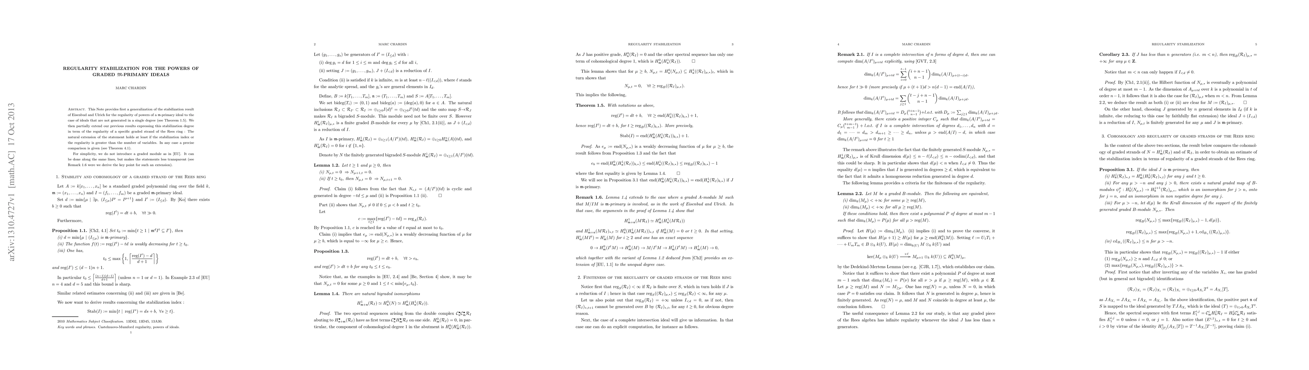This research generalizes Eisenbud and Ulrich's regularity stabilization result for m-primary ideals to non-single-degree generated ideals. It also extends previous findings, comparing the stabilization degree with the regularity of a graded Rees ring strand, providing precise comparisons under certain conditions.